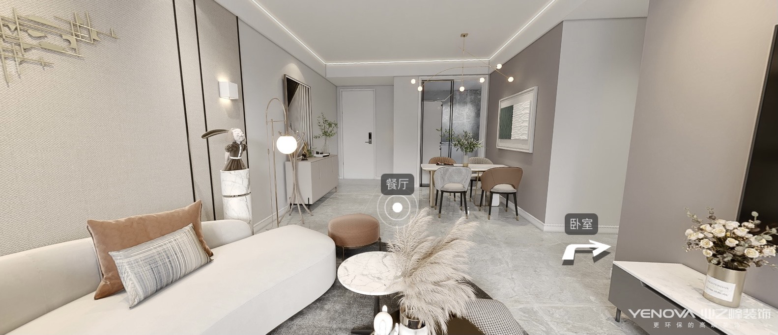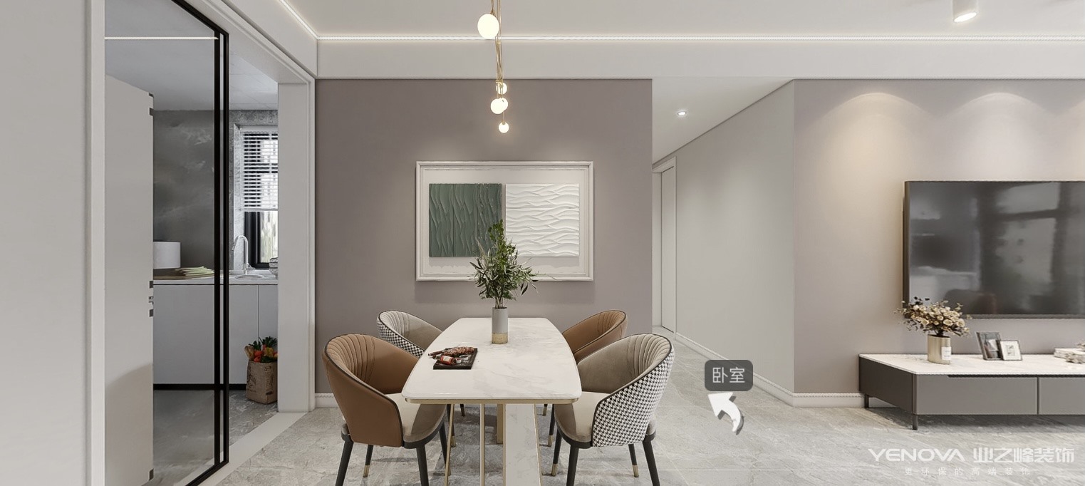 本案为现代轻奢风格,客餐厅区域划分合理,色彩搭配上采用了大面积留白辅以浅棕色、奶灰色,整体很温馨干净。金属感是本案的点睛之笔,增加情趣。