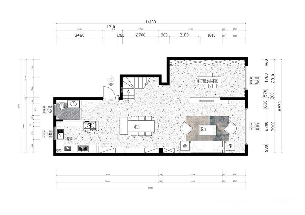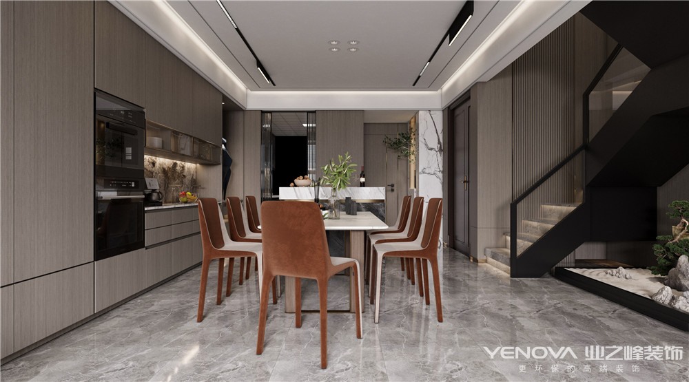 项目本身为复式结构,空间方正,墙体较少,给我们更多的改造可能性。根据和业主反复的沟通,确定一楼为休闲娱乐区,房间全放在了二楼,动静分区更合理。一楼作为休闲会客,把整个空间打开,减少非必须的隔墙,传统家庭的客餐厅区域划分明确,每个空间都较为闭塞,我们打破了传统家庭观念,把整个一楼各区域串联,让空间流动起来。