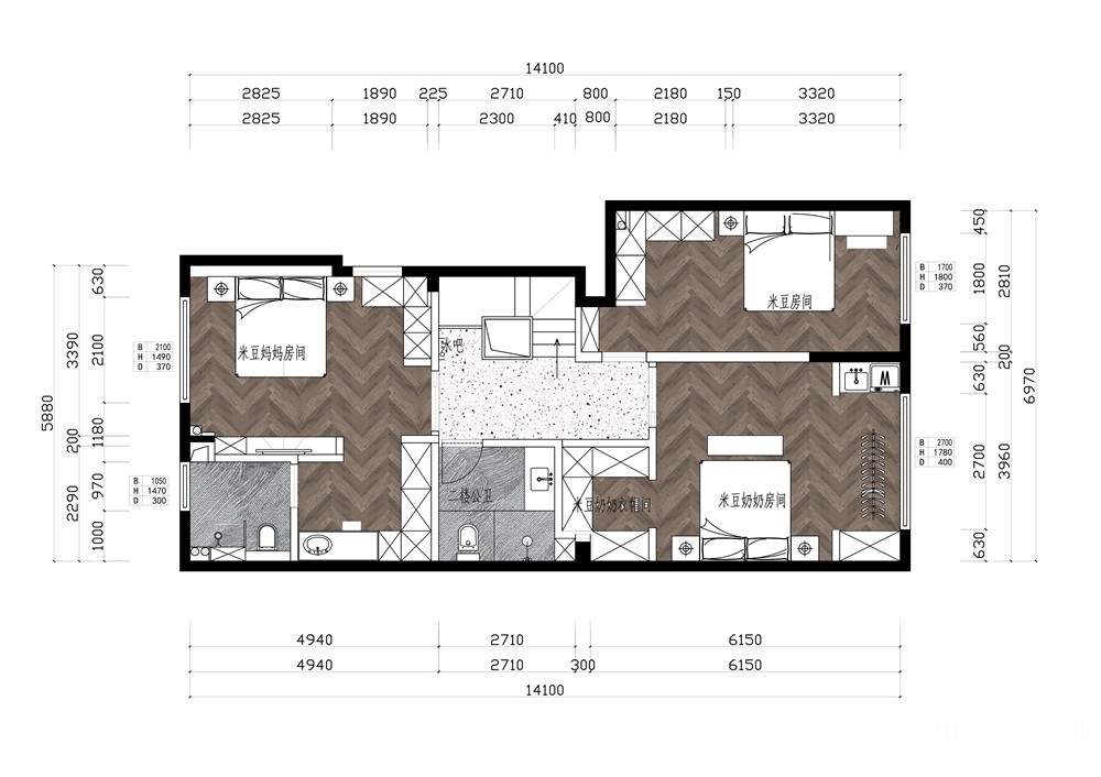 二楼为卧室休息区域。3卧室2卫生间,保证了每个房间的最大舒适度。在这一层,我们希望合理从容,回归到自然的生活中来。