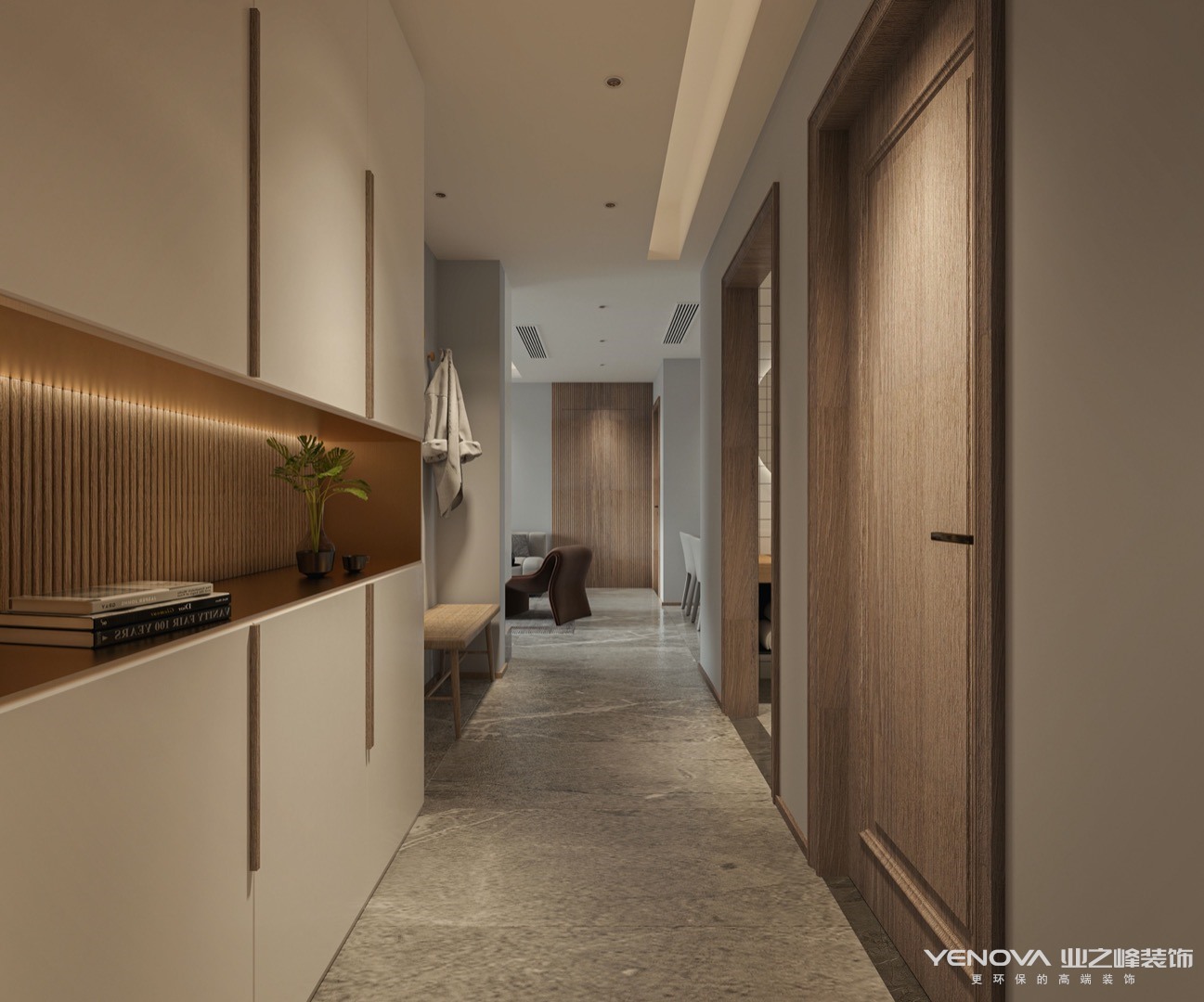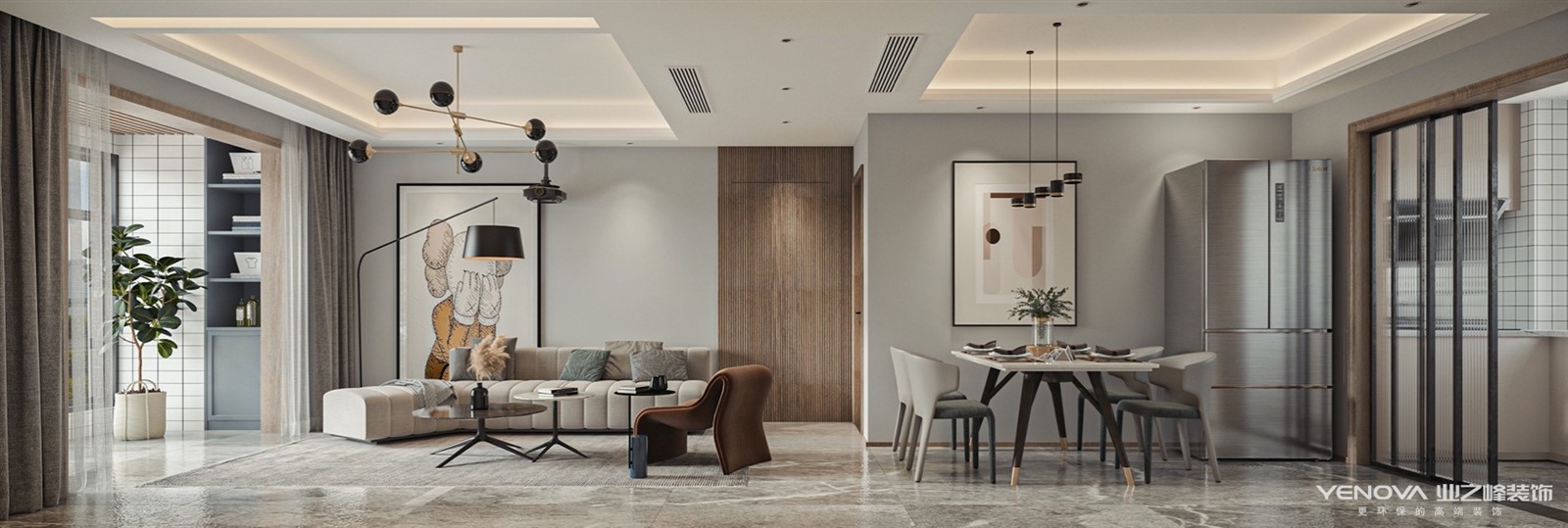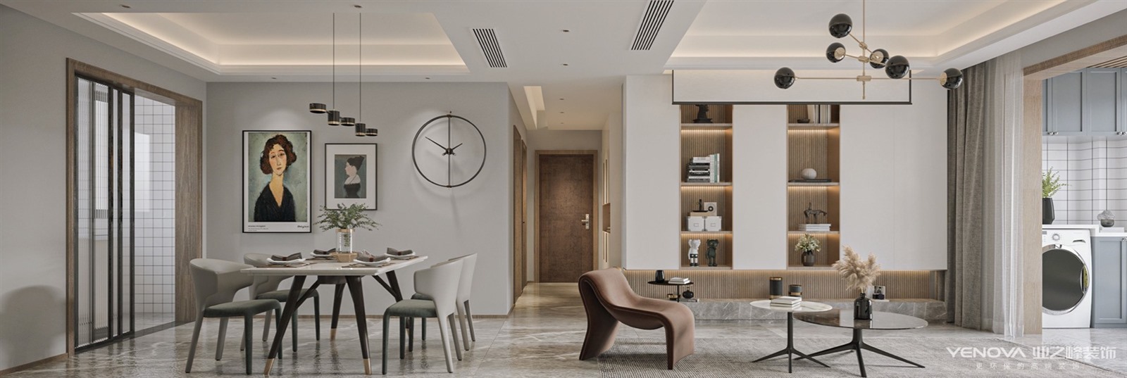 家庭中最重要的是“凝聚力”,所以扩大的公共区域成为一家人交流,玩耍培养感情的场所。利用大量的木质元素带来温暖柔和的氛围,大面积的玻璃窗让室内拥有良好的采光,光线的照耀下,大地色系的空间沉稳又舒适。除了套房式的完整设计,总体氛围融入了时尚、舒适内敛的设计元素,突出居者的沉着硬朗、睿智深刻的生活阅历及艺术品味,展现出空间的立体感受和特有的文化品位,同时也提高了空间使用者对生活品质及舒适居所的完美追求,也呼应每位居住者的个人喜好,沉稳或年轻的品味,诠释独具匠心的寝居风情。开放式的布局让客厅就算在料理,孩子们的一切动态也都呈现在眼前,设计师利用地面材质的不同让各功能区互相连通却又各自保有区别,没有了隔断的阻挡,空气与光线自由流通,整个空间都弥漫着欢乐安逸的气息。