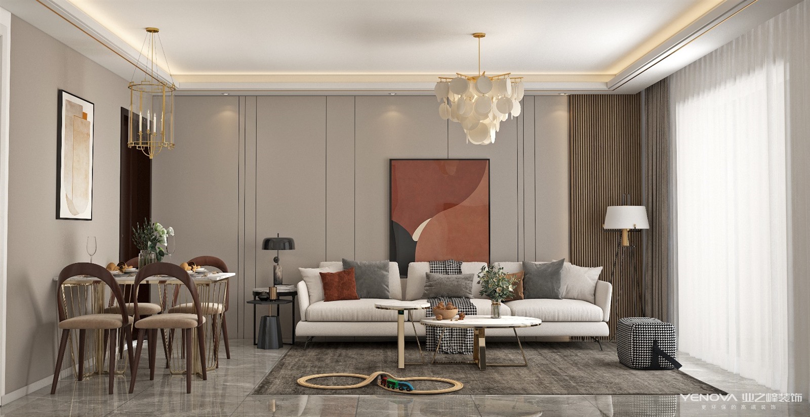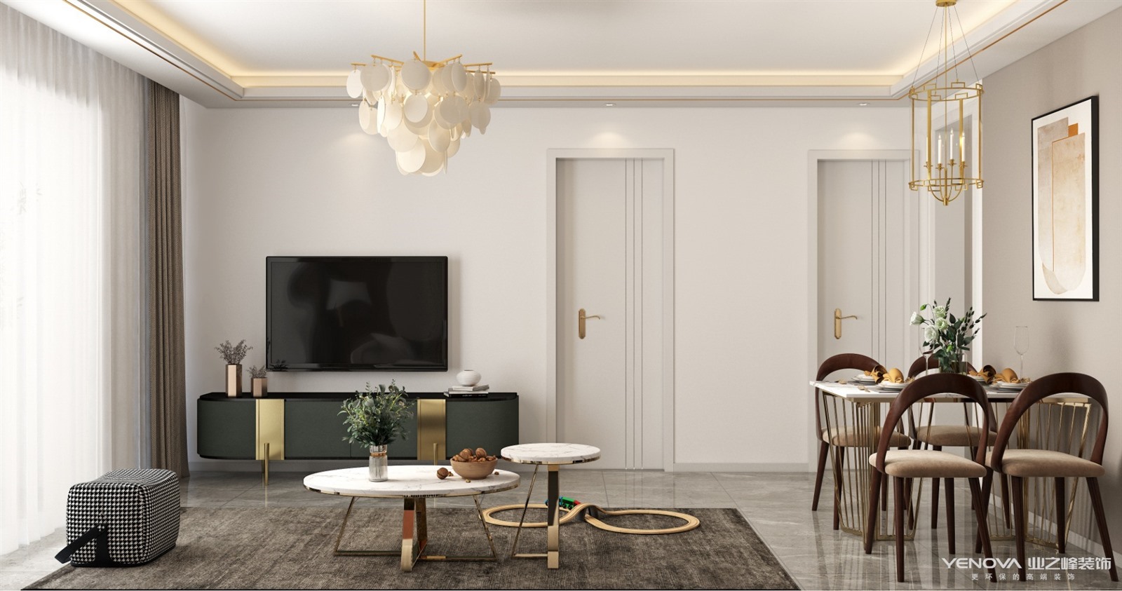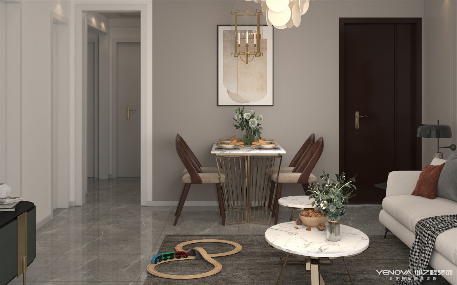 本案为现代简约风格,整个色调以原木色白色为主,又有粉色点缀,满满的少女心,客厅吊灯采用圆片点缀,让客厅更加梦幻,餐厅采用的是蜡烛吊灯,烘托氛围,每天下班回到家都能享受到烛光晚餐。
