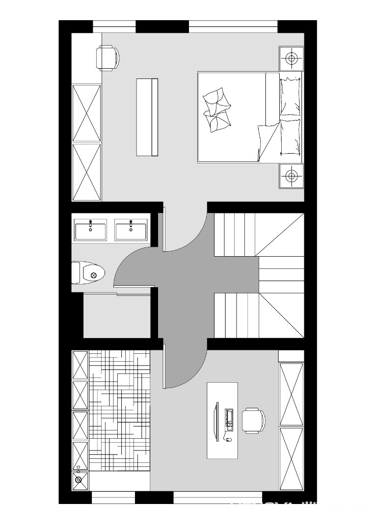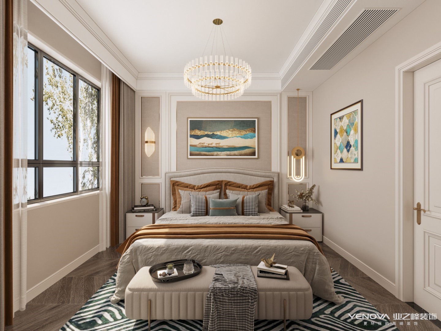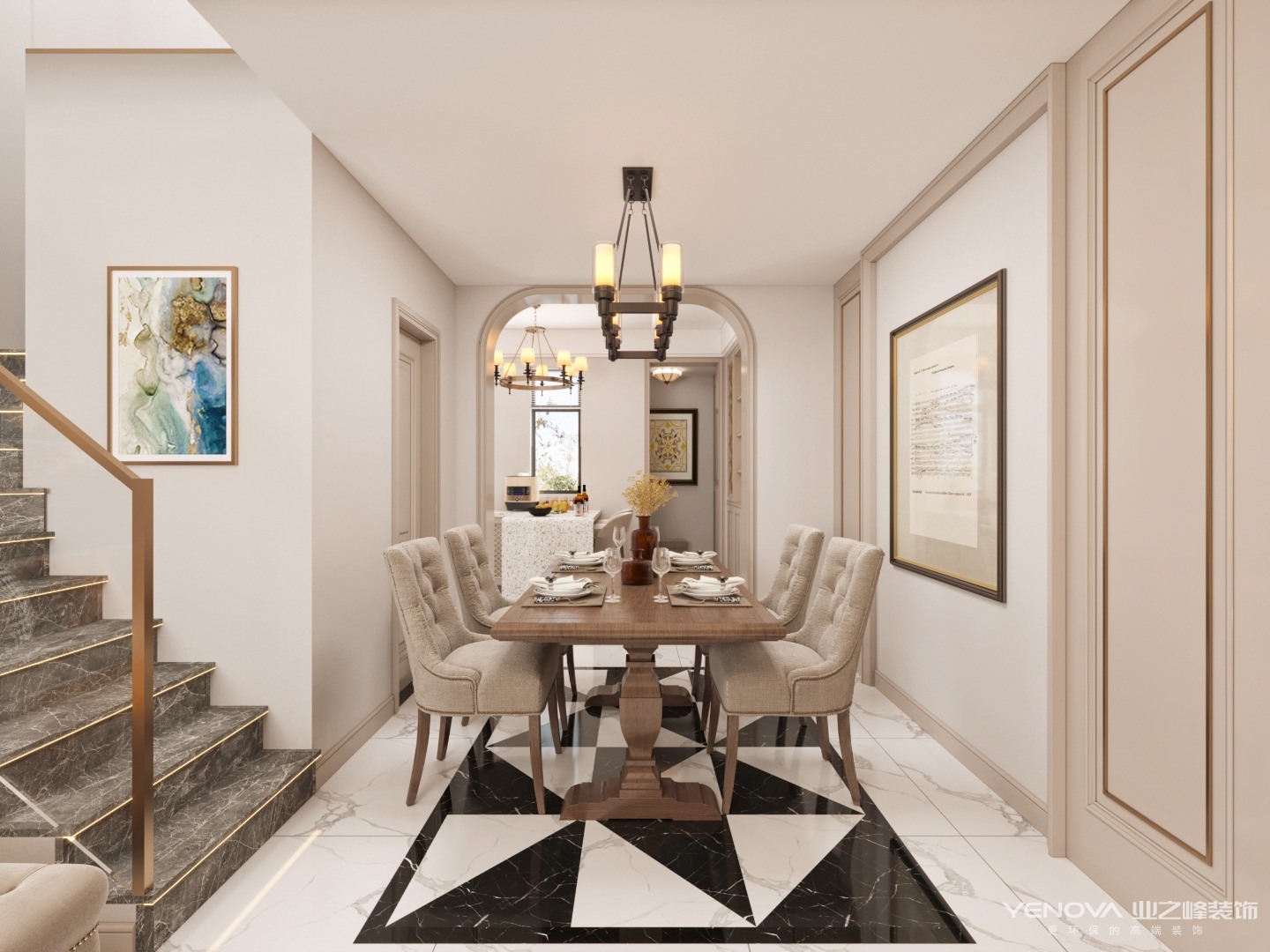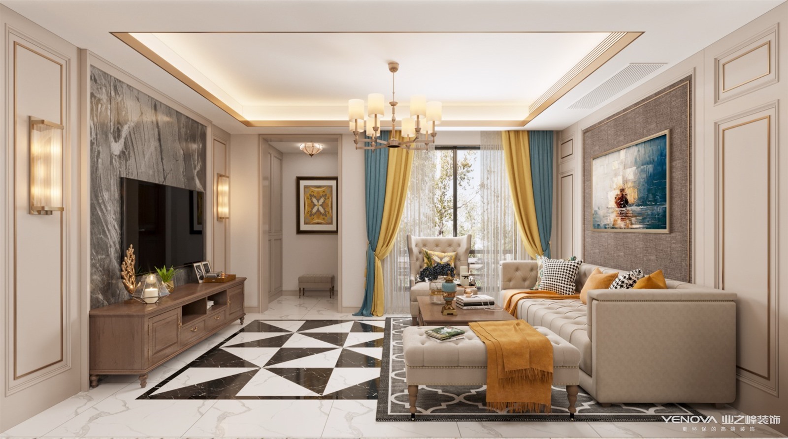 本方案为法式轻奢风,在空间中引入法式优雅的美学意涵,糅和浅色色调的淡雅与金属色调的富丽,以一种精致优雅的形态散发着艺术美感。在与现代时尚的轻奢风相遇后,则凝结成一种文艺优雅,与众不同的空间意境。在整体的空间中,搭配金属线条让整个设计更有层次感,同时家具也选用了佩带有现代时尚的金属装饰,与整个空间相呼应,电视背景选用深色大理石加金属线条分割板与背景石材,层层呼应,对空间的每一处细节都构成了韵律的和谐。