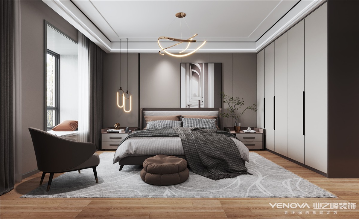 主卧的地毯和客厅一样,纹理朴实粗糙,与棉麻质感的床品搭配;使空间透出一丝温暖与随性,结合上方的金属吊灯,又多了几分精致感.