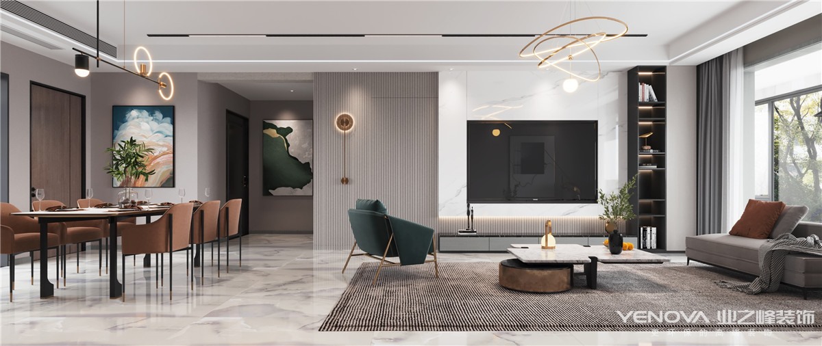 咖色餐桌搭配木制餐椅,顶部的吊灯造型也十分独特,圆形与长条形的搭配充满几何感,暖黄色的灯光透出精致简约的感觉。