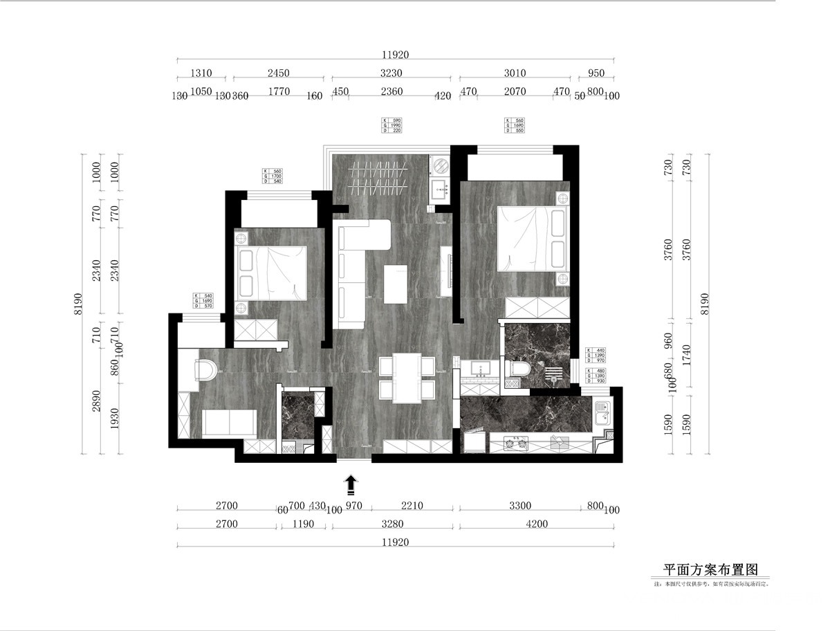 本套方案以现代中式风格是中式元素与现代材质的巧妙兼柔的布局风格,它同时明清家具、窗棂、布艺床品相互辉映,经典地再现了移步变景的精妙小品。新中式风格还继承明清时期家居理念的精华,将其中的经典元素提炼并加以丰富,同时改变原有空间布局中等级、尊卑等封建思想,给传统家居文化注入了新的气息。