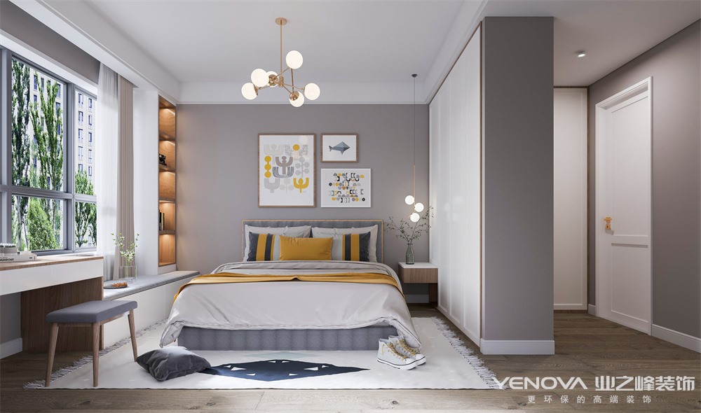 卧室:造型设计上,点与面、直与斜应有机搭配,天花板、空间与各种材质需要紧密结合,让人感受到空间的清澈、晶莹剔透。