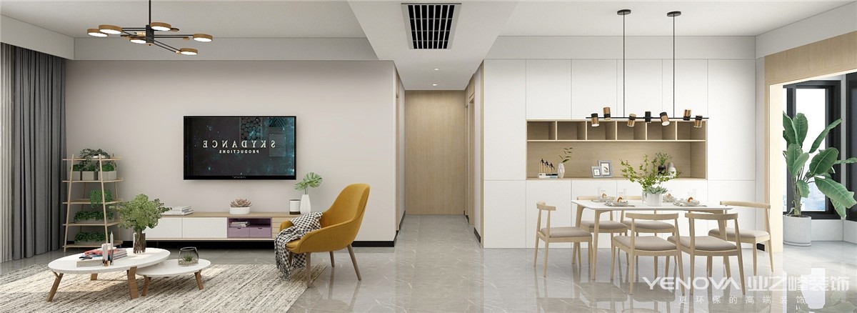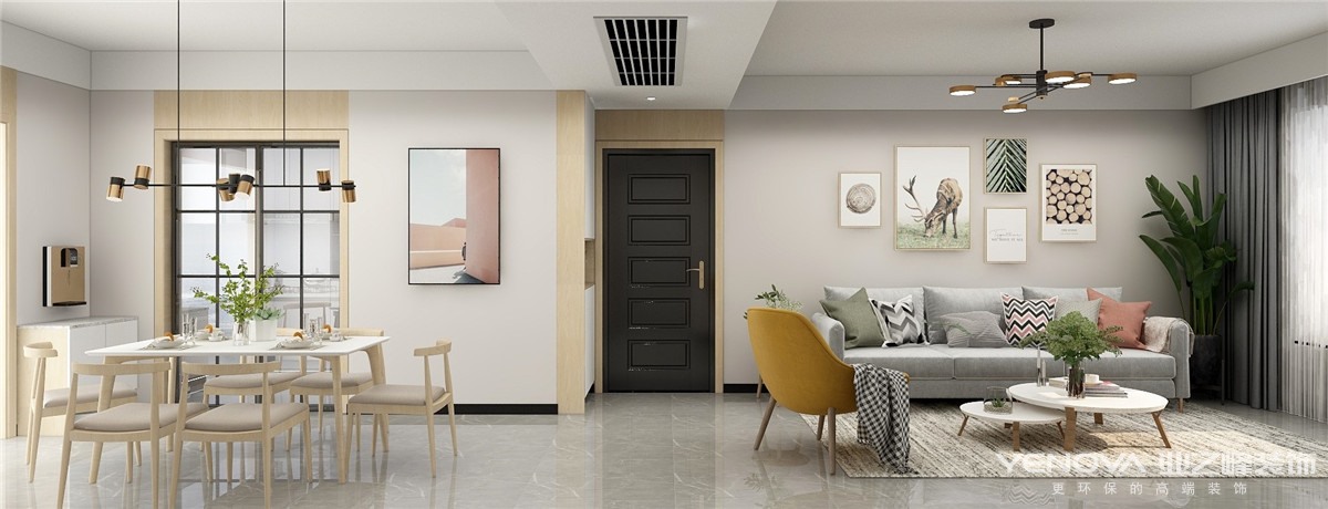 本案例为北欧风格,业主喜欢自然、清爽、温暖的环境。客餐厅墙面运用了木色门套线,选择了原木色北欧风餐桌及餐椅,沙发选用了布艺沙发,营造舒适宜人的感受。