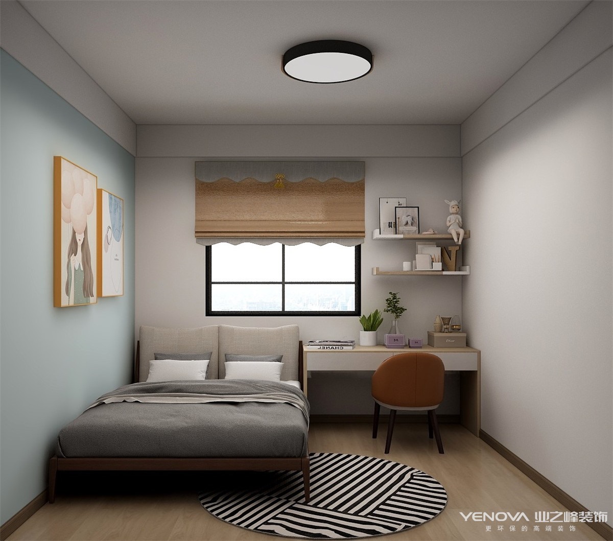 儿童房空间,选择淡蓝色乳胶漆搭配墙面,使空间感官活泼、温馨。