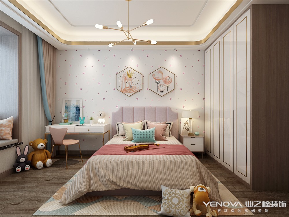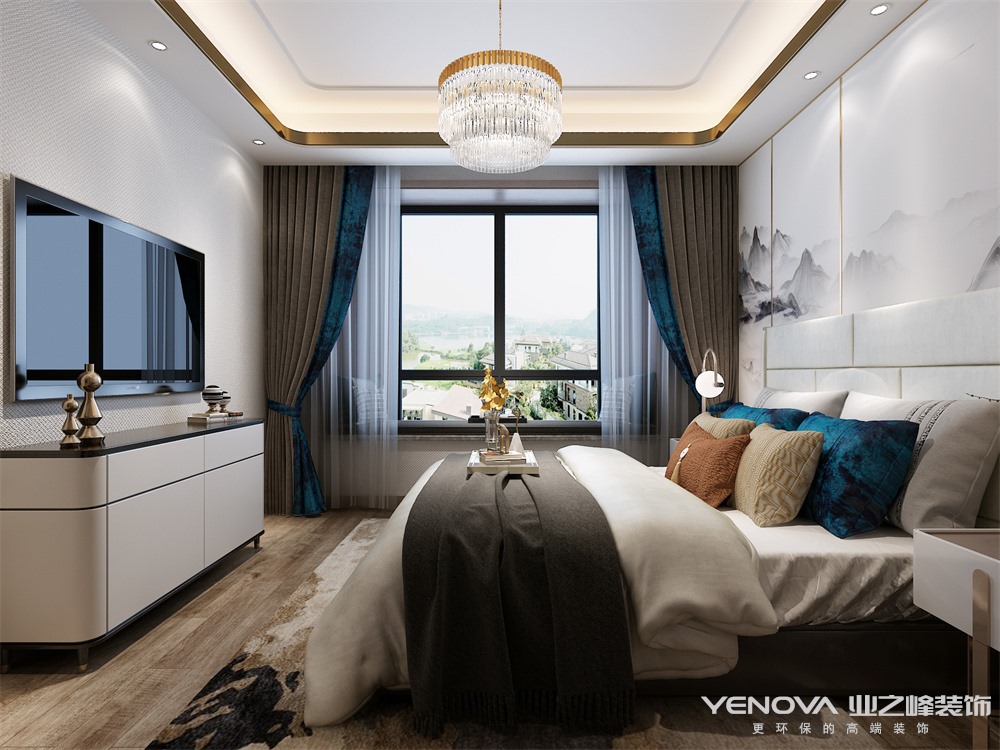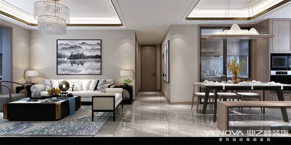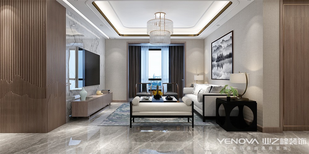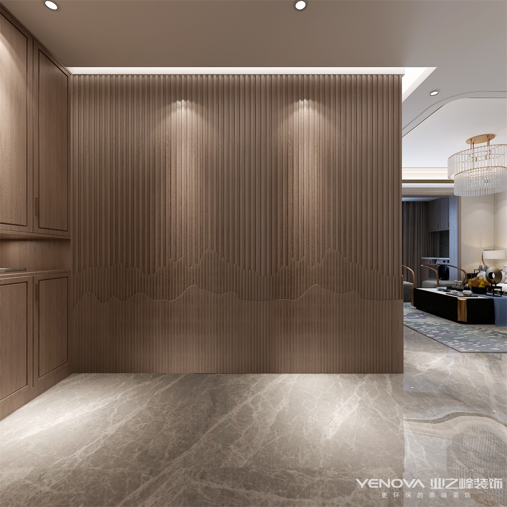 1、在不改变原有户型格局的前提下,通过立面的墙板的设计,将客卧的门采用隐形门的手法,与墙板颜色材质相统一,呈现出一种山峦起伏的延续感,凸显出新中式的飘逸与禅意。