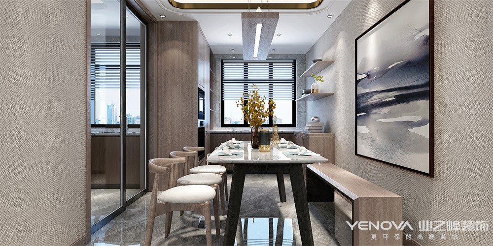 2、原有厨房较小,可将中西厨分开,借用餐厅靠近窗户的区域,做开放式西厨区,高低柜错落,台面区充足,功能完备,西厨与餐厅和二为一。