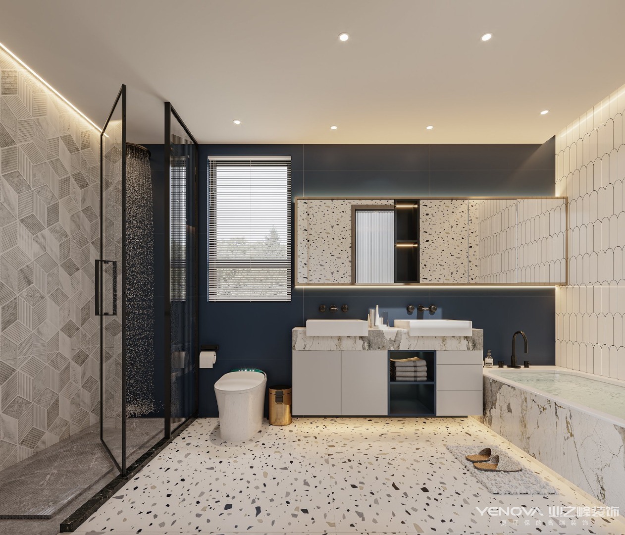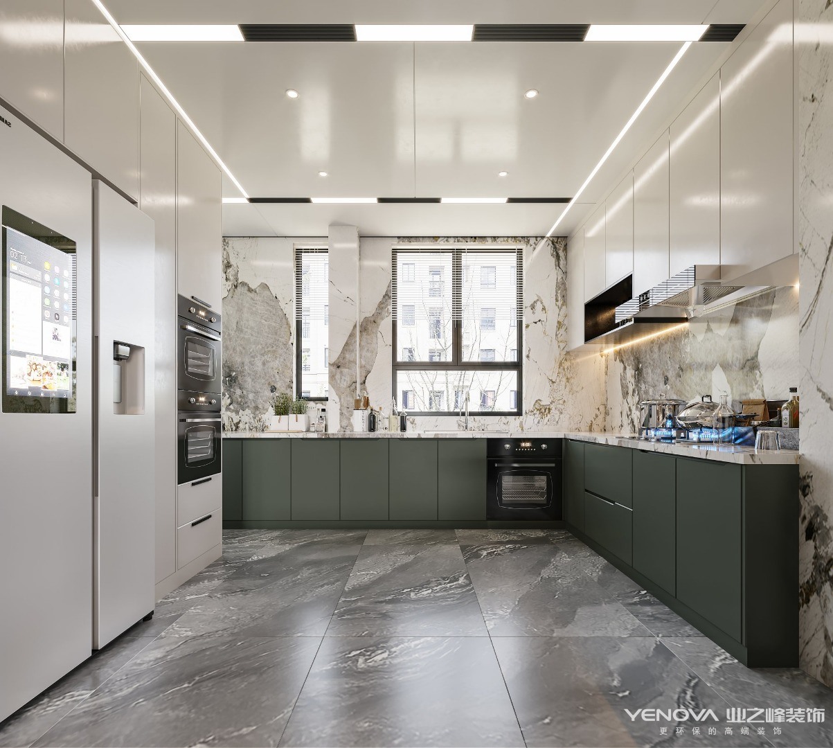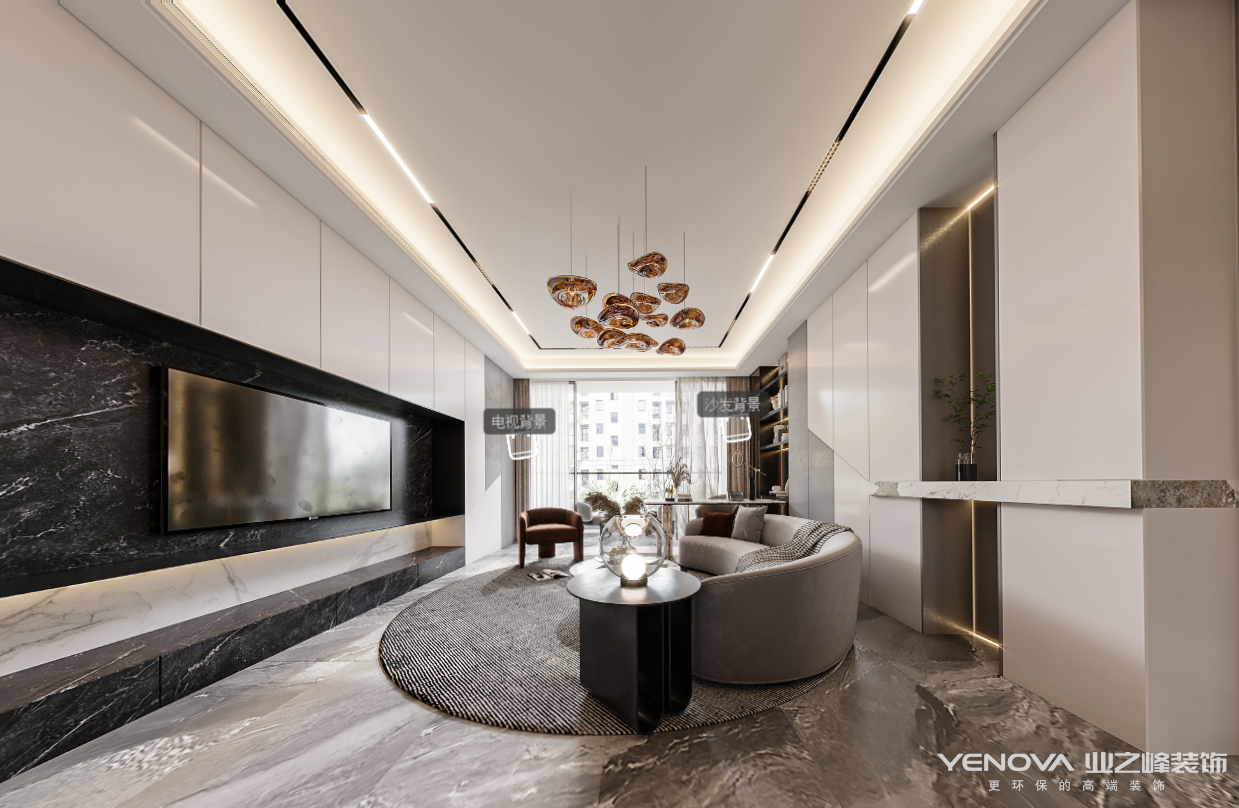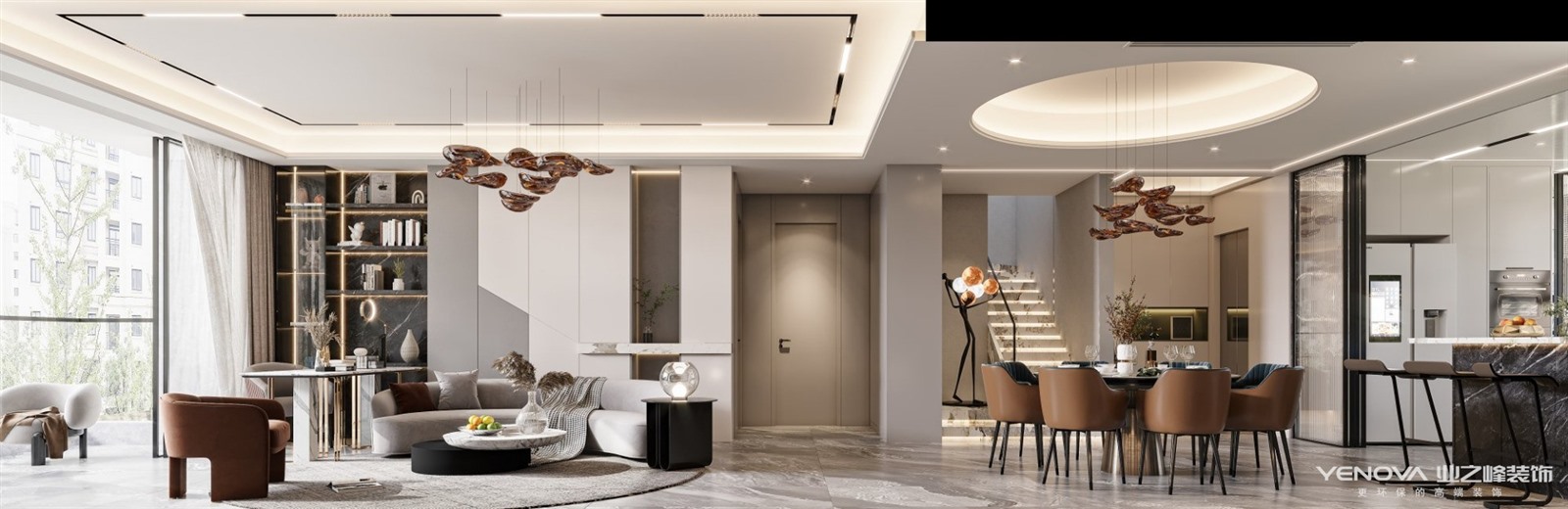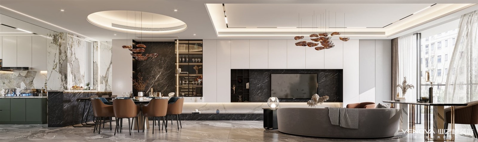 开放式布局是形式和精神的交汇融合,整体以大理石为基础,白色为主调,暖棕色作为点缀,加上简约的线条在视觉上给人一种精致的现代体验,厨房、餐厅、客厅、书房浑为一体,大幅提升视野通透性,各空间模糊界定,也丰富了空间的趣味性,即拉近了家人之间的情感距离,又突破传统却不丢失其灵魂,秉承其理念,呈现出永恒的当代设计美学。