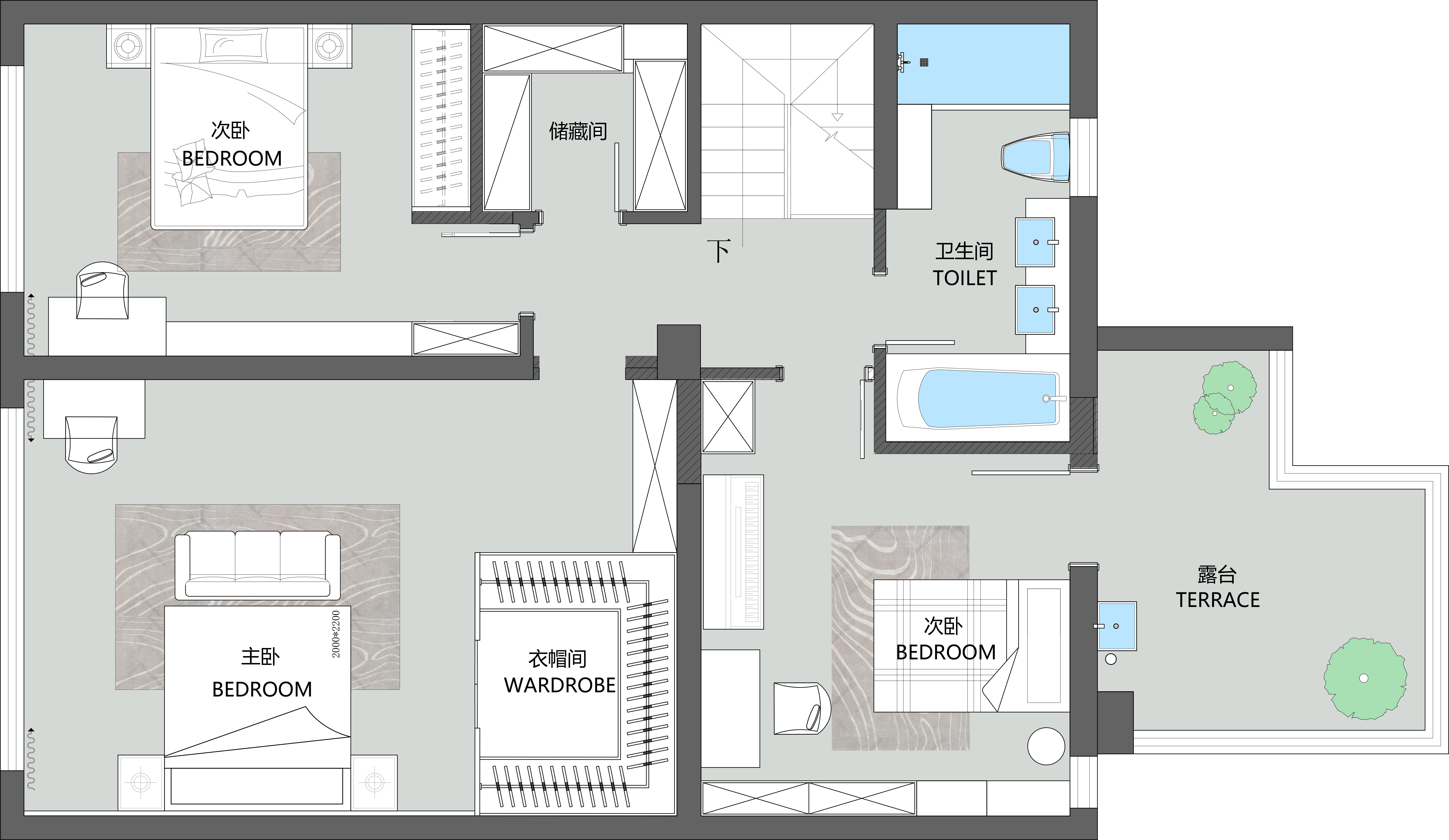 此案为现代轻奢,“轻奢”顾名思义,它代表着对高品质生活细节的追求。本案是毛坯房,客厅区域为挑空区域,需求是四房,在想不改变其他房间大小的同时又能满足四房间的需求,我们则是把客厅挑空的区域现浇起来,而二楼现浇起来的面积则作为主卧。