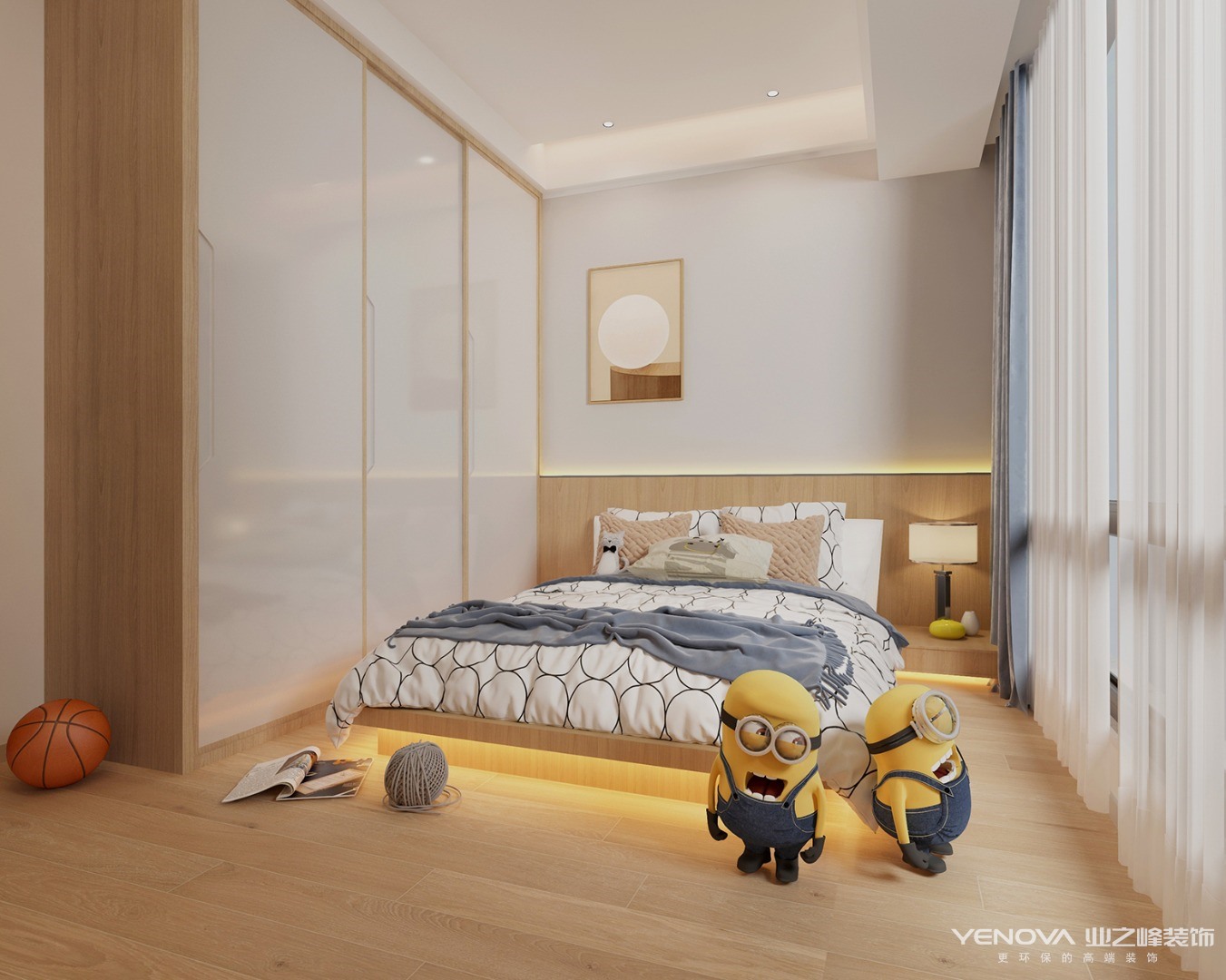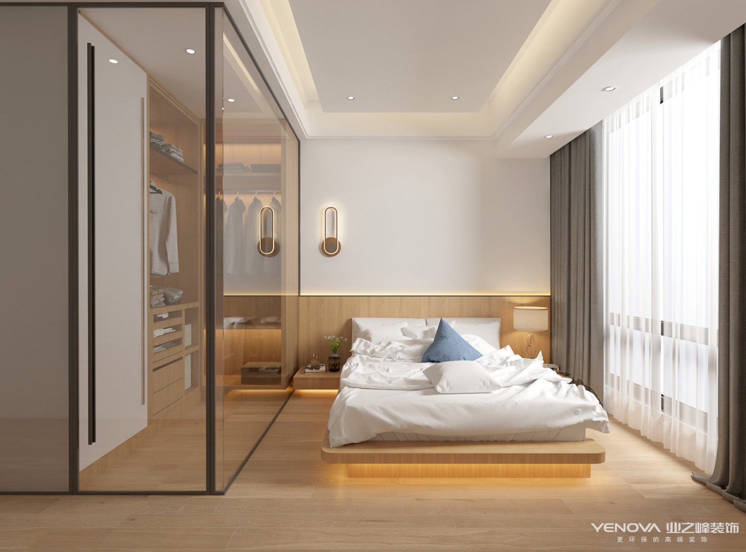 卧室均采用了定制床体的方式,,内部设计采用了减法排除繁杂的造型,床体及床头木饰面都有暗藏灯
