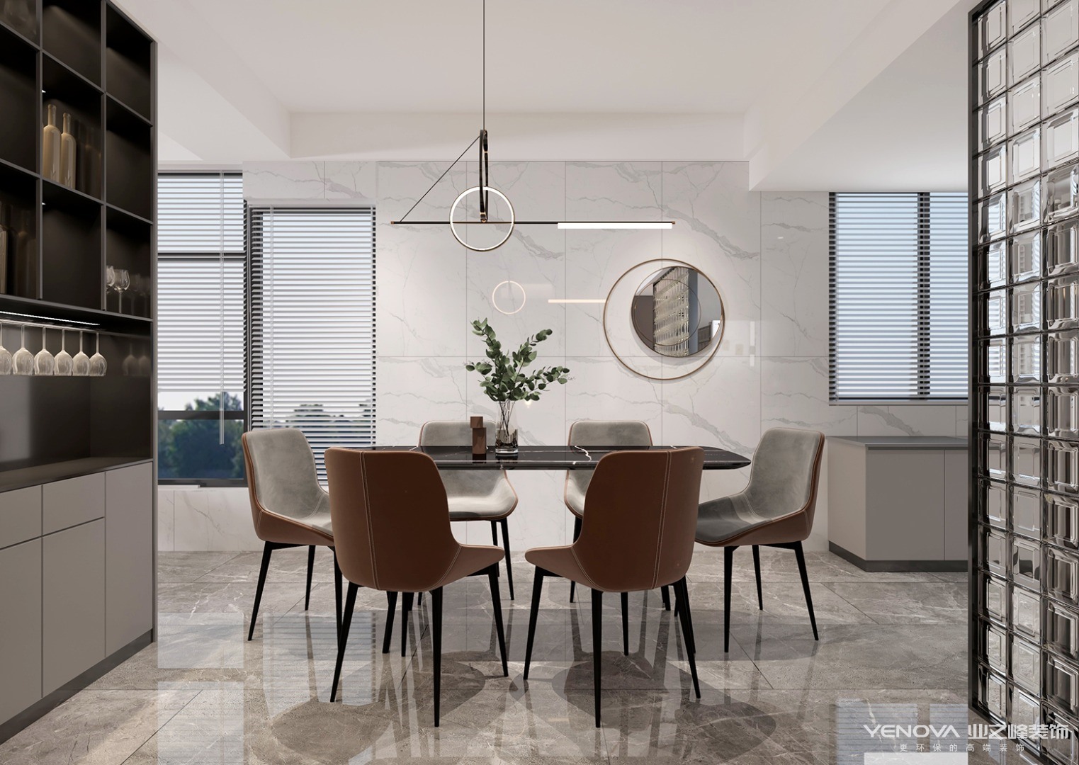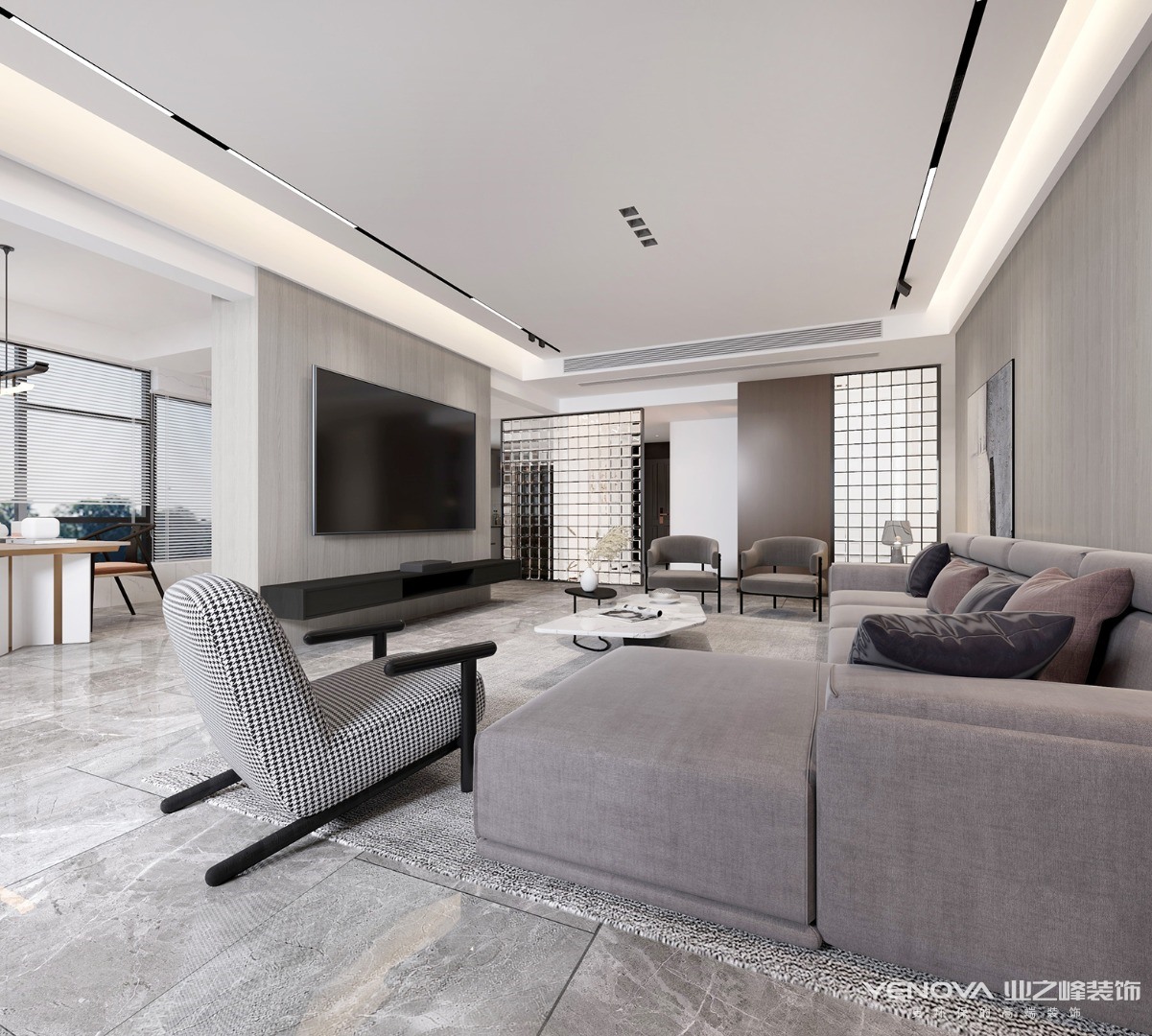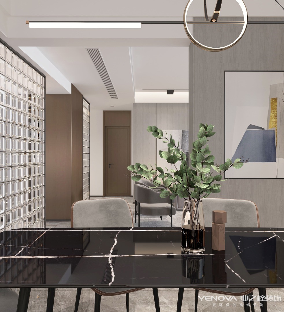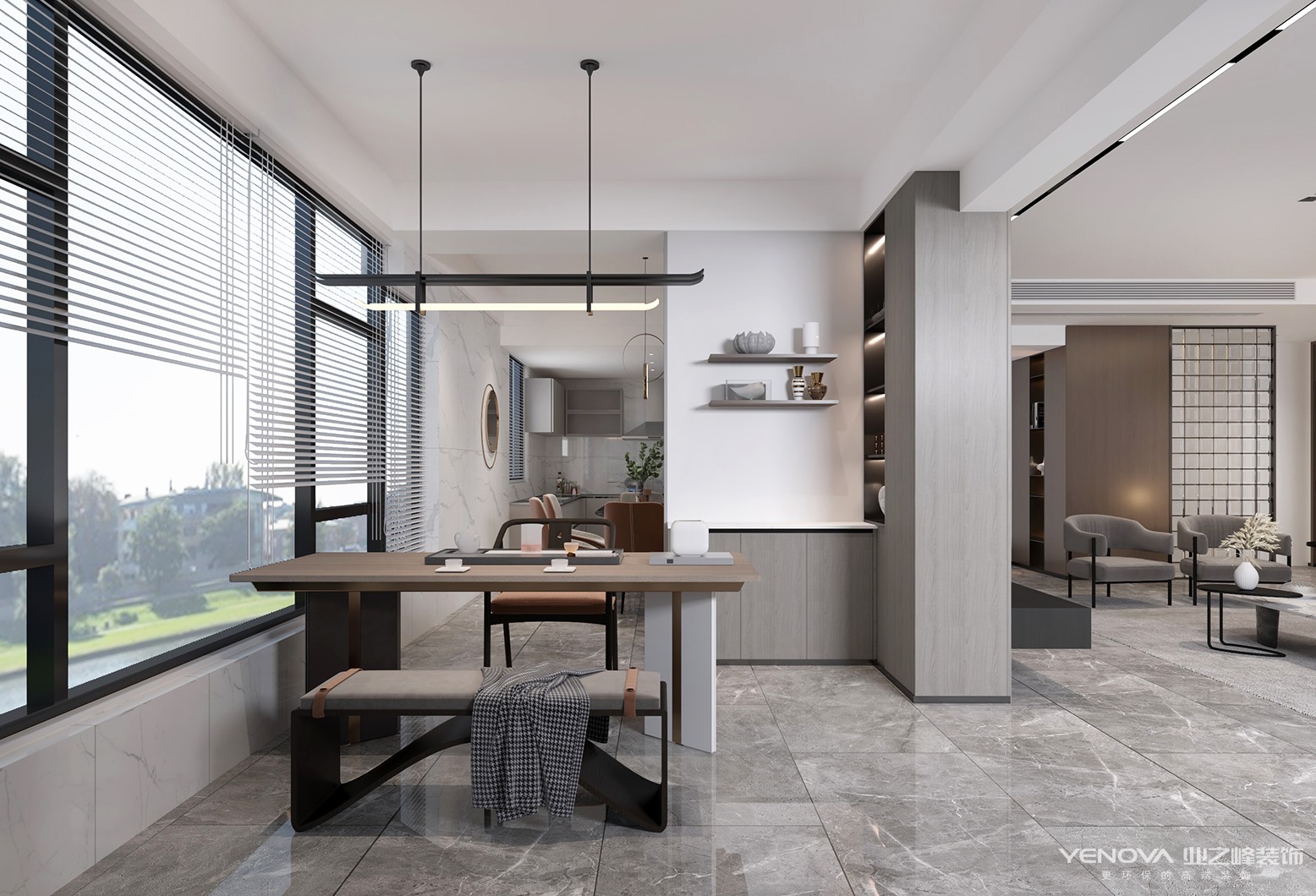 窗外江景。在空间的动线上我们形成了“回”型的开放空间,客餐厅、茶室的开放格局形成一个整体的