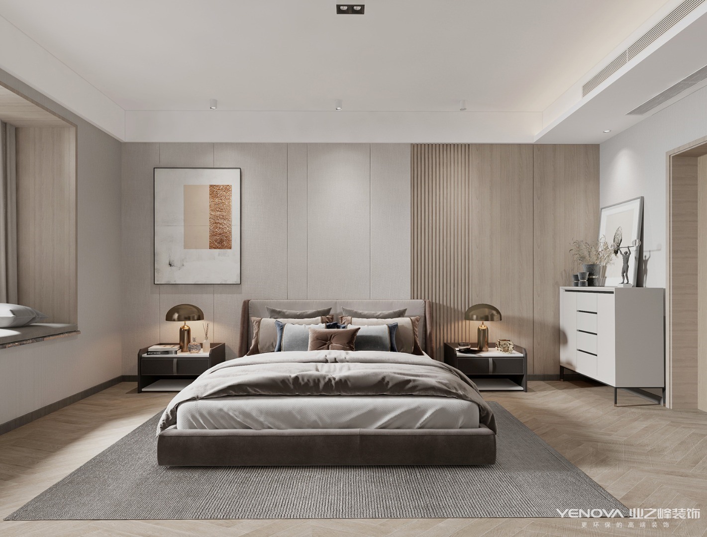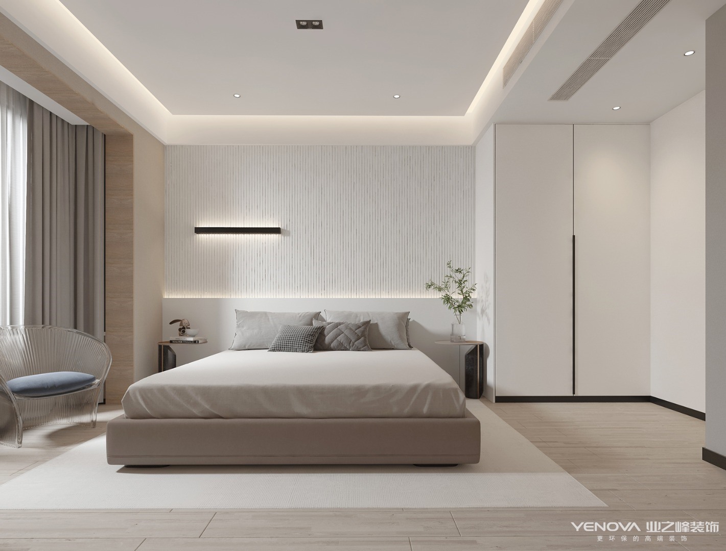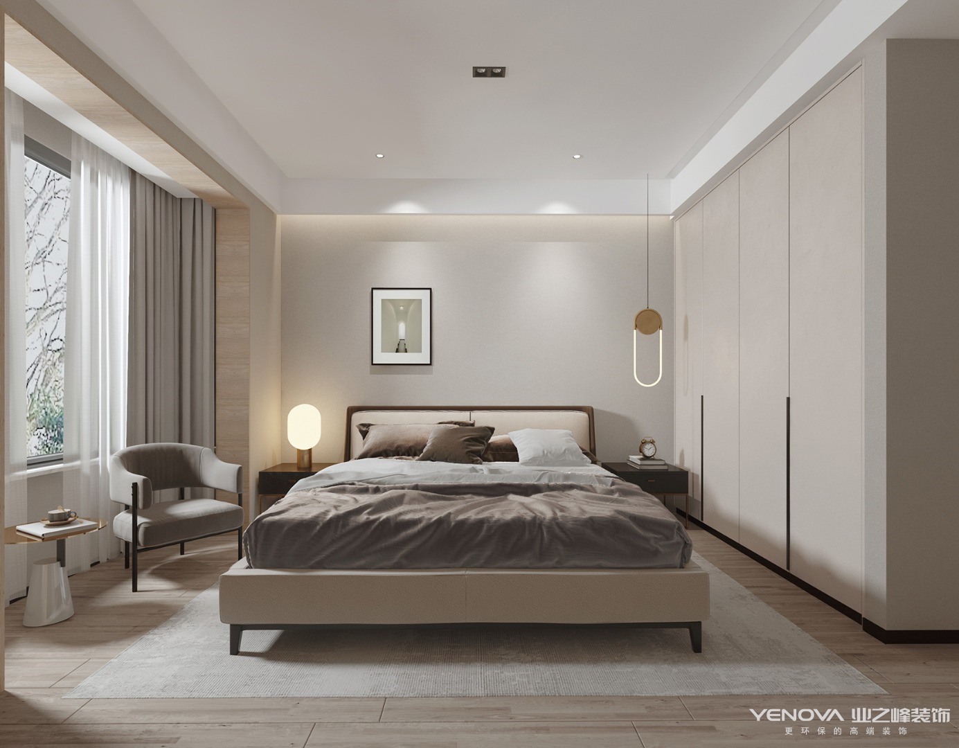 卧室氛围将直接影响居住者的心情,在卧室的设计中我们采用了浅色的硬包墙面与原木色的木饰面连贯