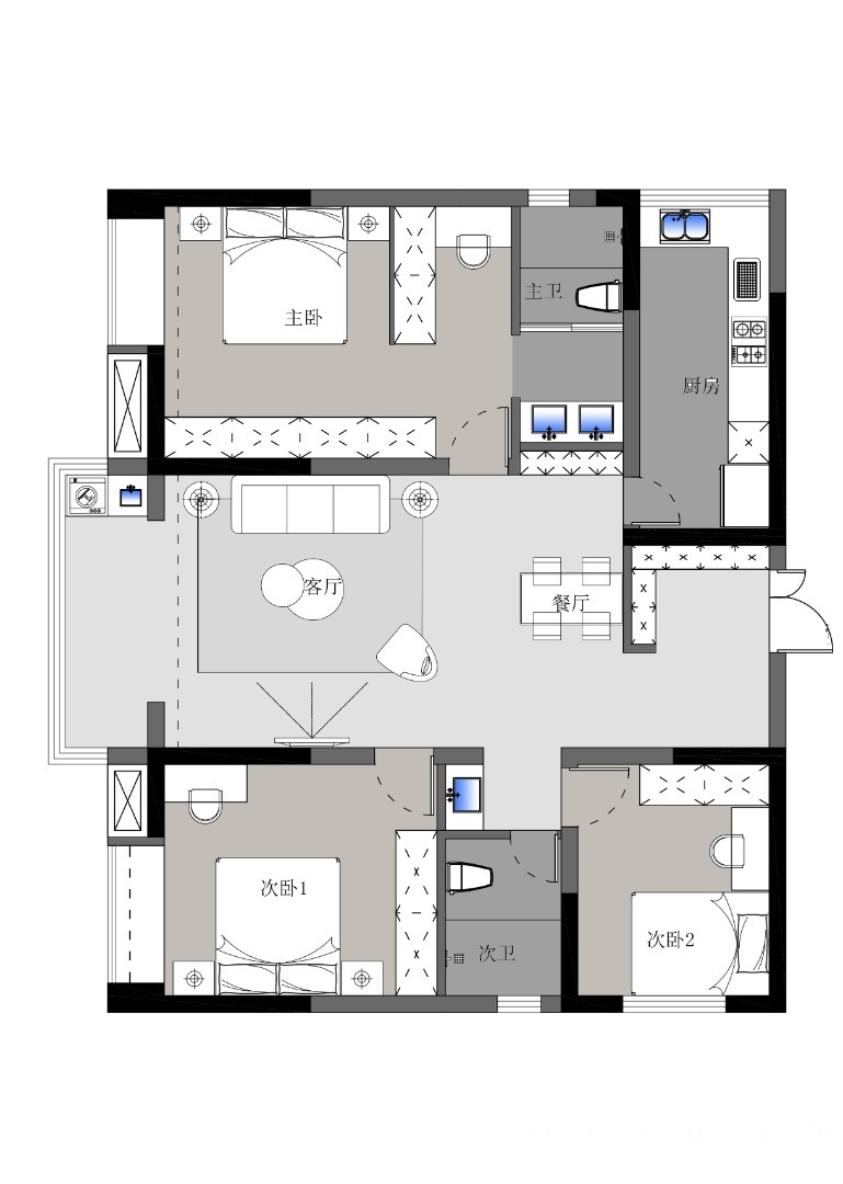 本案的业主都是上班族,平时工作比较忙,家里有两位退休的老人和上初中的孩子,想要两个卫生间都做成干湿分离,储物空间要多,女主人想要主卧增加一个衣帽间,