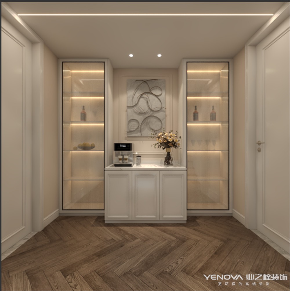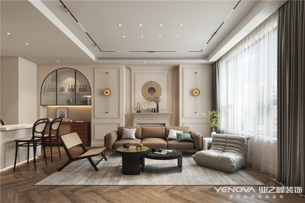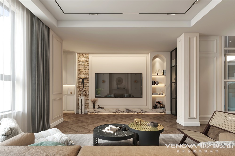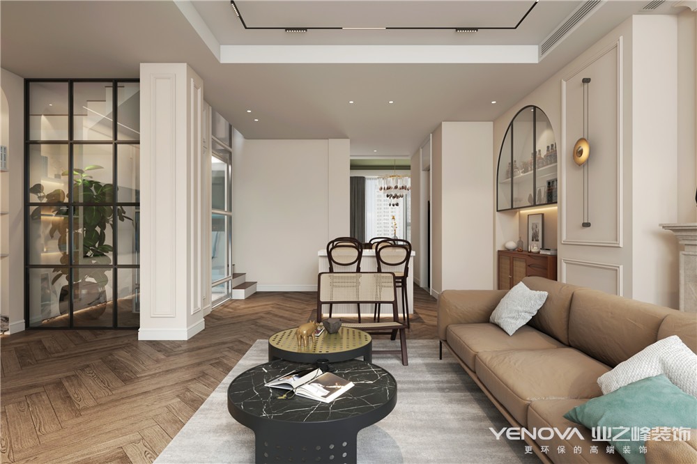 客厅:以温润素白的主基调,作为空间氛围的起点,将现代法式风进行多元化演绎,精致的雕花造型石膏吊顶,秩序与结构的结合。,诉诸着空间的艺术氛围,串联时光,自由流转。用现代的设计手法,采用开放式布局,带有艺术性的沙发围合出一种优雅浪漫的设计共感,在这里,现代家具被赋予更多质感。