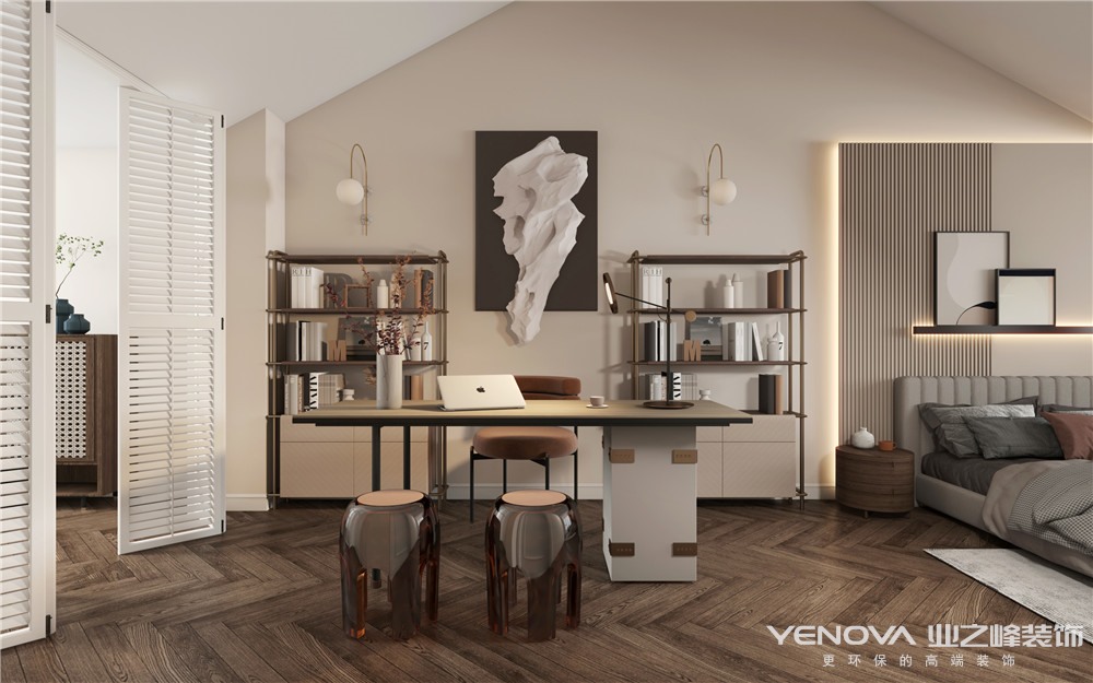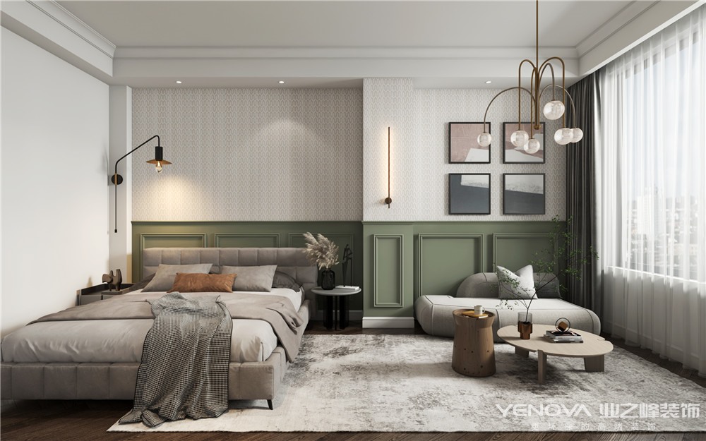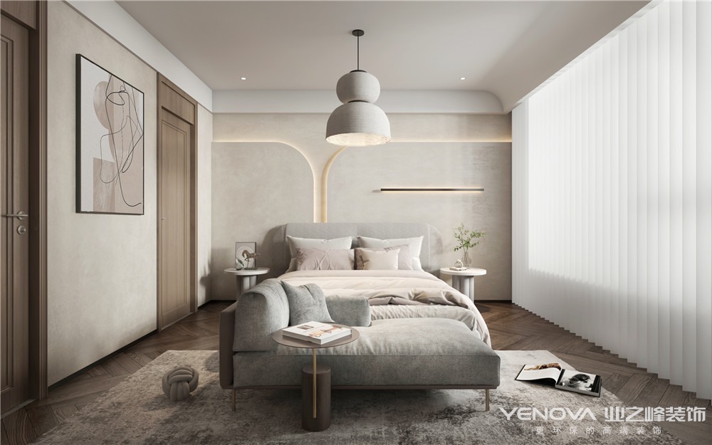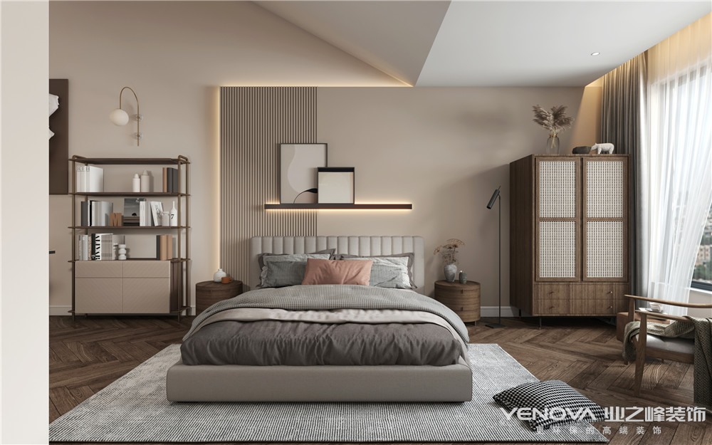 主卧;主卧将优雅格调契合于空间的留白,没有增设过多的陪衬与摆设,使纯净雅致的空间基底更具为纯粹。原木质感的围合,点缀少量现代元素,同时引入窗景,烘托出休憩空间的舒适氛围。