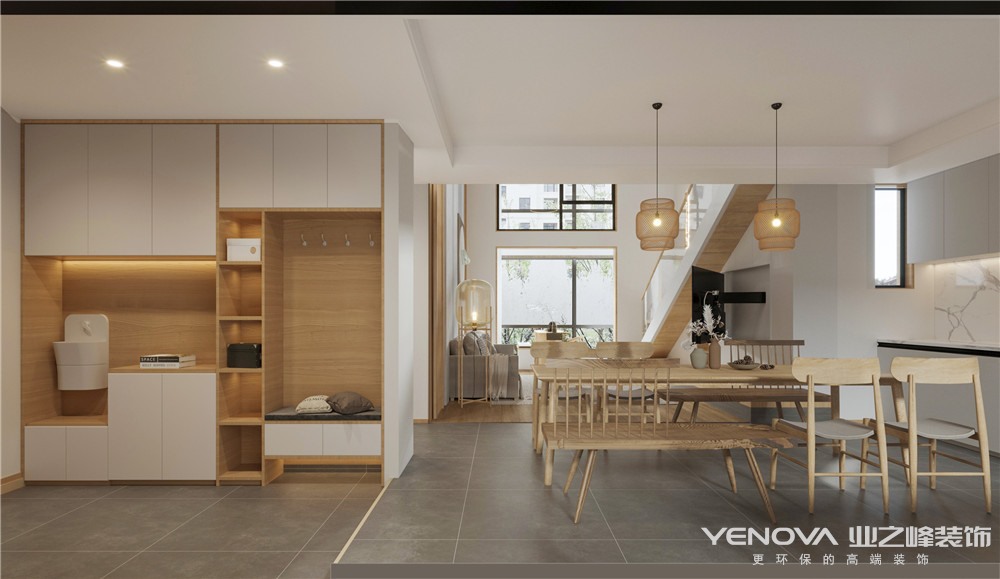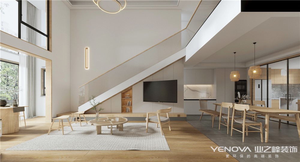 客厅:客厅色调清浅而纯粹,原木色与水泥灰的运用给整个空间带来温润的触感。没有过多繁杂琐碎的装饰、抢眼的色彩,让空间回归朴质无华的简约基调,还居者一片舒适自在的居心之所。设计师将楼梯靠墙而立,巧妙的利用楼梯下位置做储物以及电视休闲空间,没有采用繁杂的墙面装饰,日式空间内的简洁与温馨得以发挥