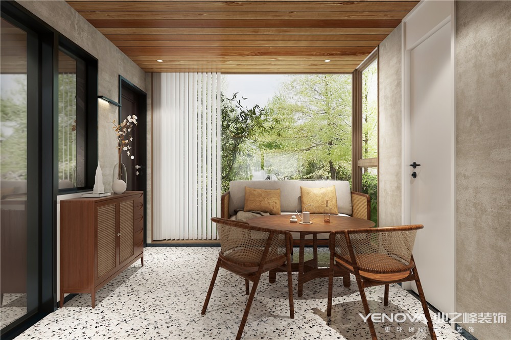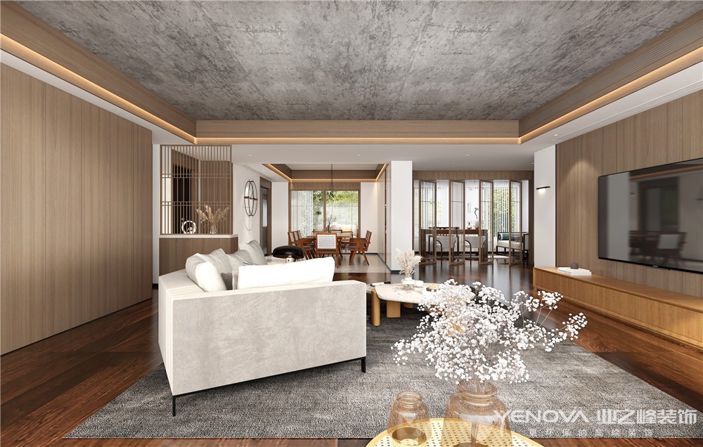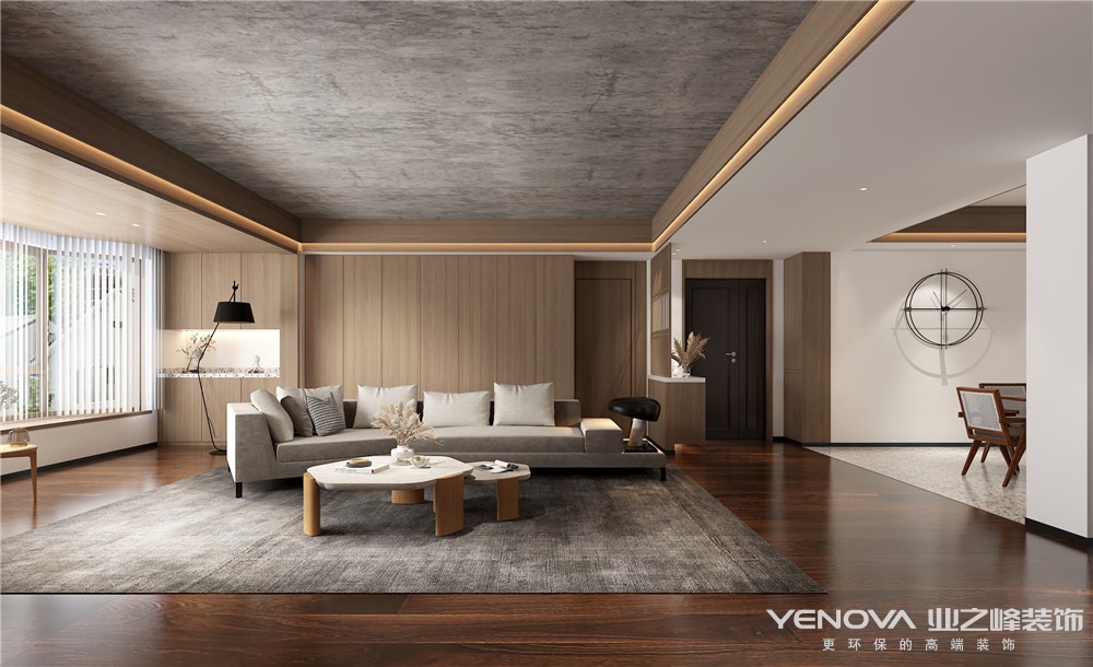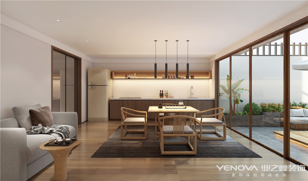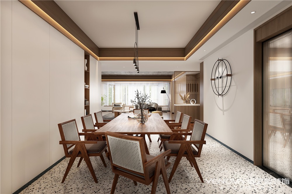 餐厅:灰白色系的运用营造出一种清幽的感觉,赋予木纹的家具与吊顶。让整体更加素雅。而灯光的烘托让冷清中多了几分暖意。