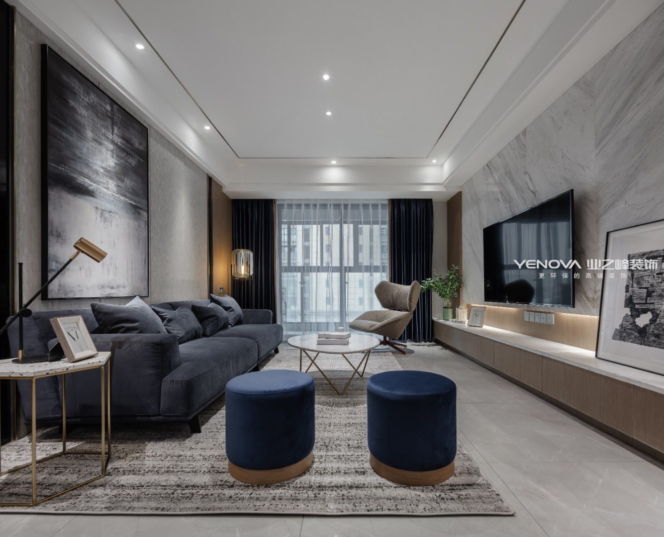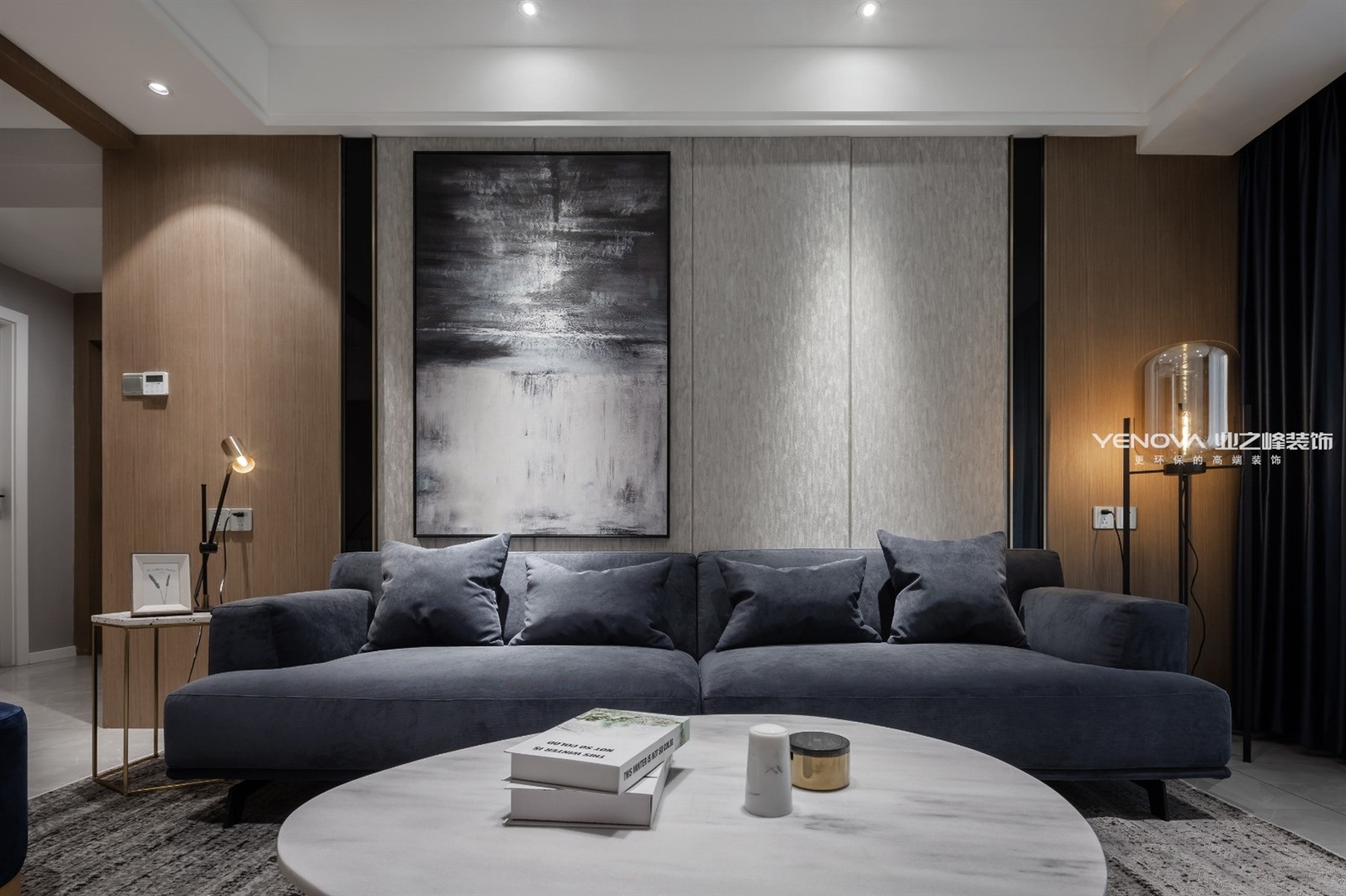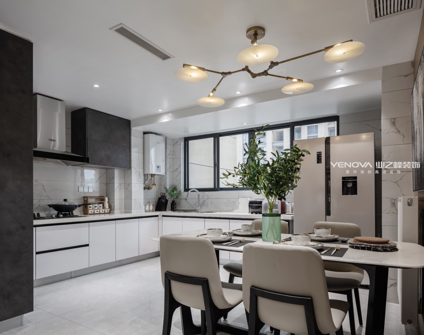 本案是 98平的两室室户型,现代轻奢风格。在这套房屋的设计中,将静谧的灰色灵活运用其中,通过重新整改空间占比,优化生活动线,灰色的背景墙贯穿在整个室内空间,给人一种深邃静谧的生活气息。厨房以白色为主基调,显得十分整洁大气,内部功能也一应俱全。每到晚餐时刻,一家人齐聚,显得非常温馨。