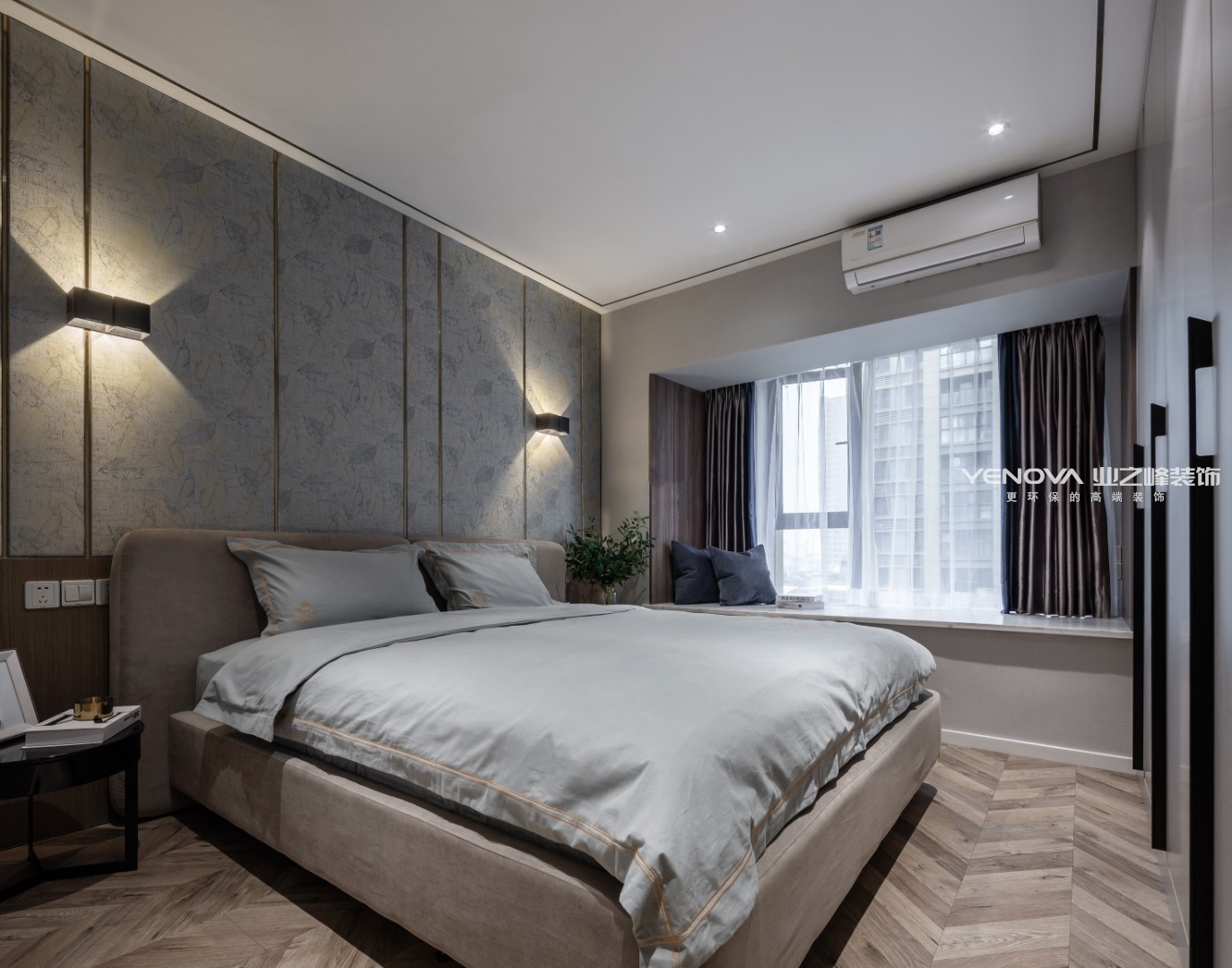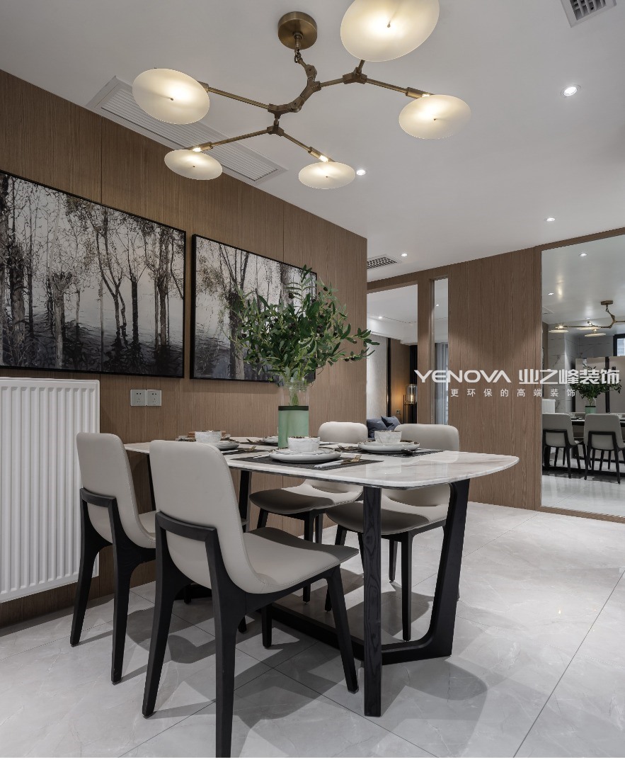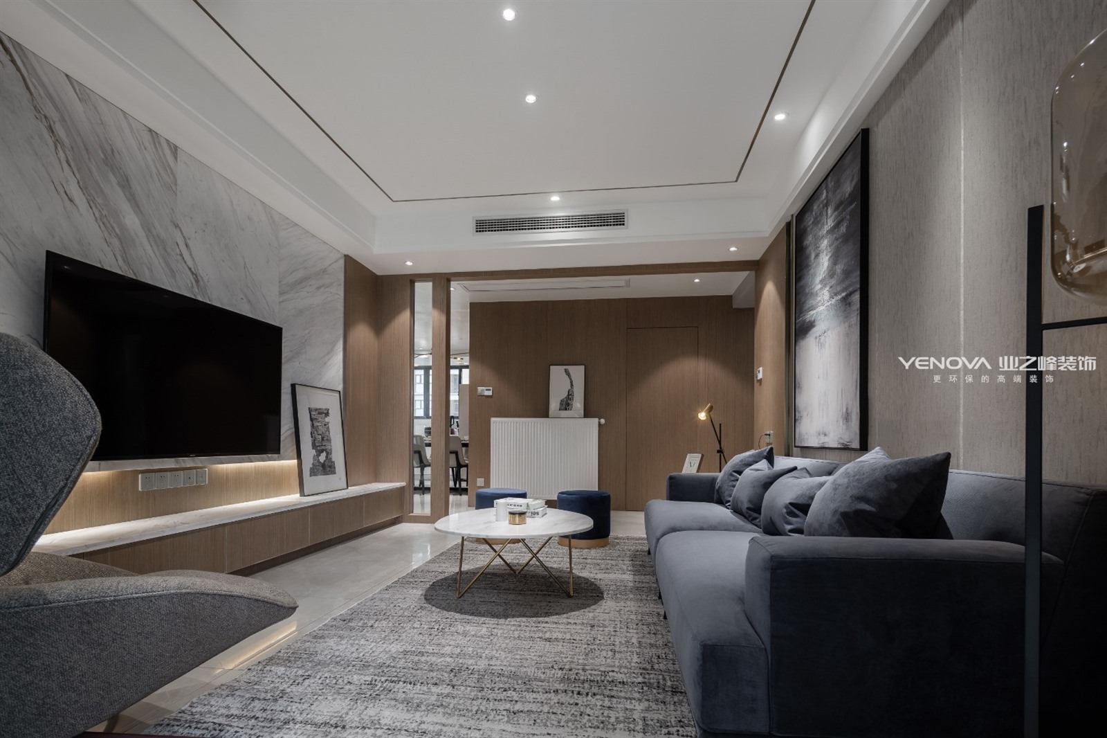 本案是 98平的两室室户型,现代轻奢风格。在这套房屋的设计中,将静谧的灰色灵活运用其中,通过重新整改空间占比,优化生活动线,灰色的背景墙贯穿在整个室内空间,给人一种深邃静谧的生活气息。厨房以白色为主基调,显得十分整洁大气,内部功能也一应俱全。每到晚餐时刻,一家人齐聚,显得非常温馨。