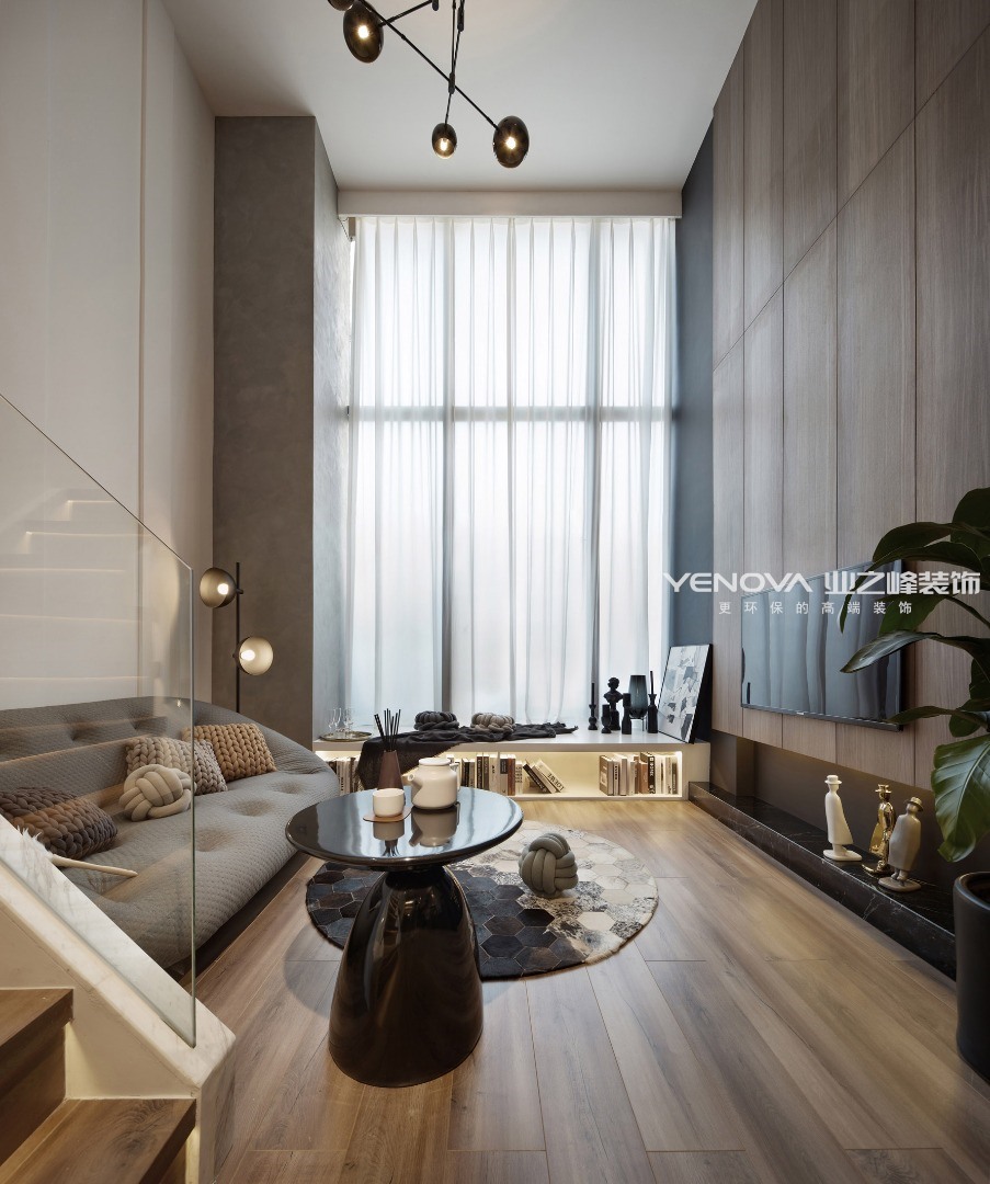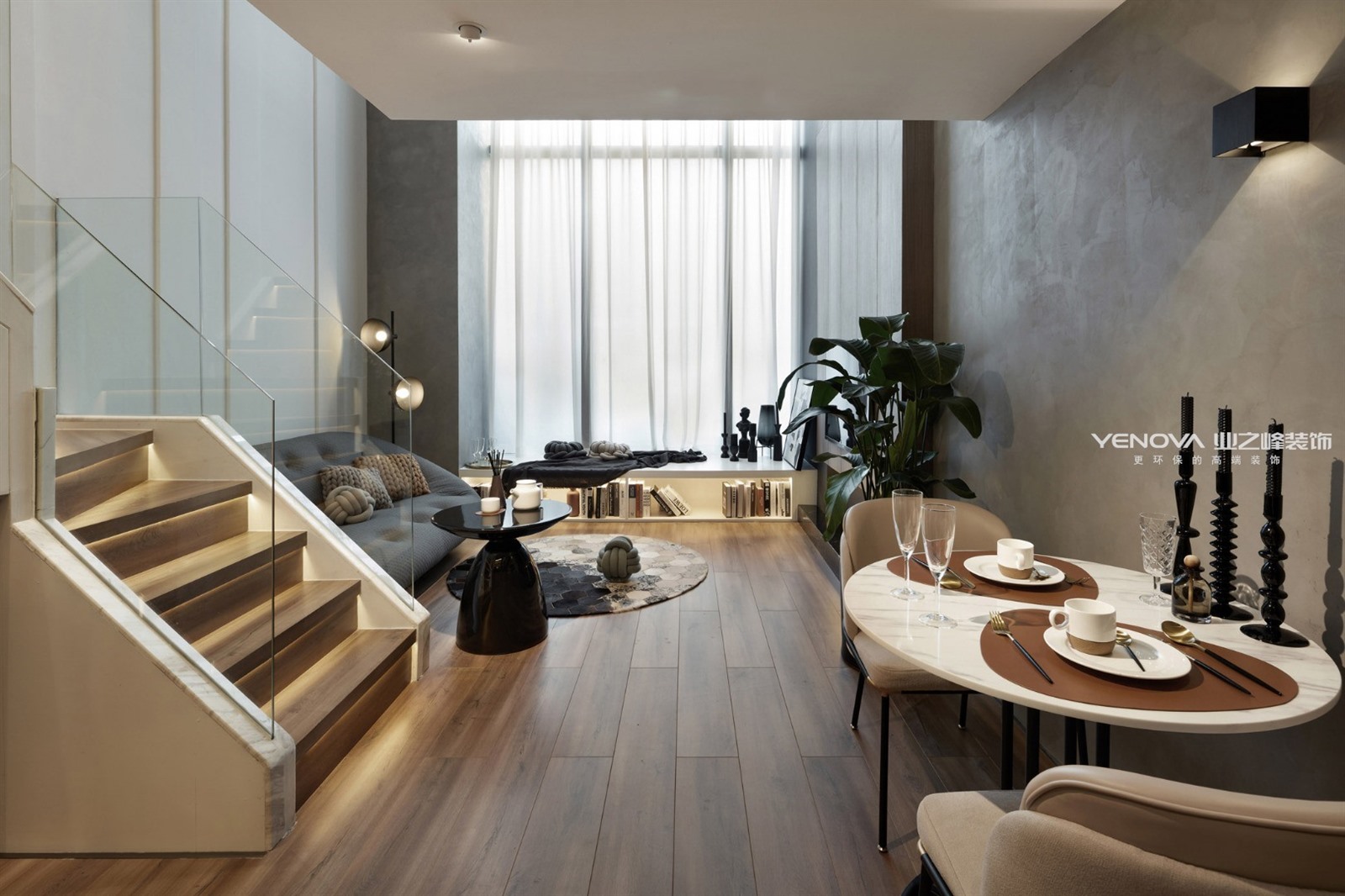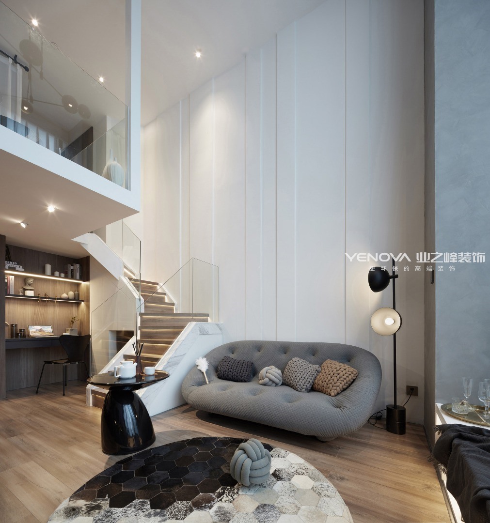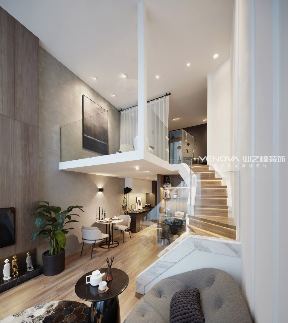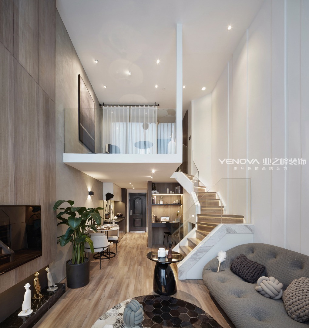 本案是 40平的loft户型,现代简约风格,loft的居住模式,是一种审美趣味,也是一种生活的态度,几乎每个空间都是开放的,保留了客厅的挑空的区域,面积不大因此全屋用木地板,楼梯踏步饰面也选用同色系木质的,与地面衔接,形成统一。造型上,没有过多的造型装饰,简洁大气。