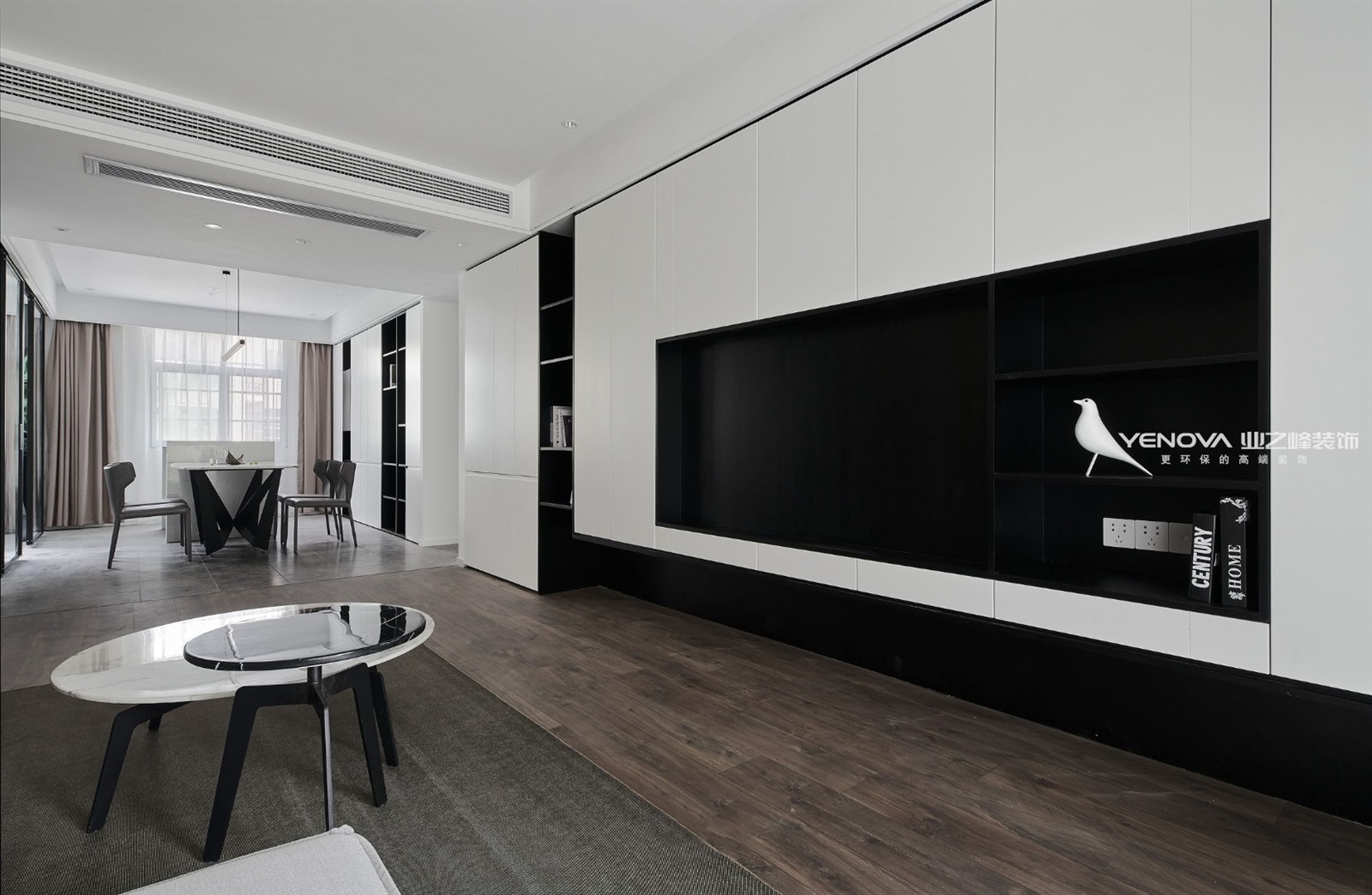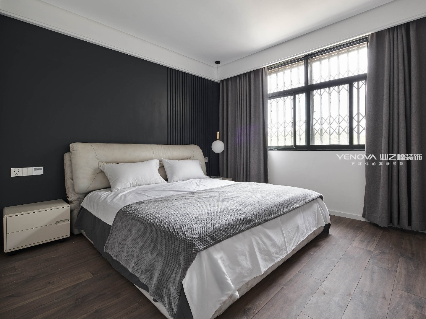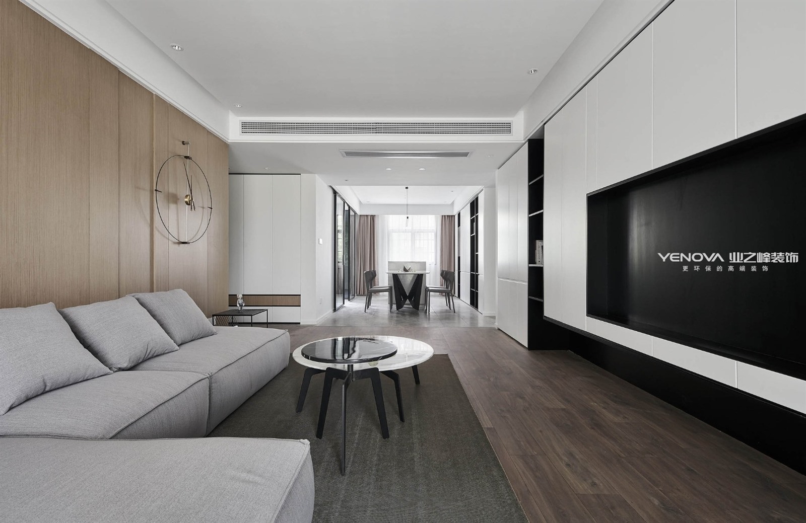 本案是150平的三室户型,现代简约风格,客餐厅同出一空间,整体选用黑白灰为主色调进行设计,沙发背景选用原木色系的木饰面弱化了黑白的生硬感,简单大气。餐厅延续客厅色调大部分主要以纯白为主,提亮用餐空间整体色调。主卧纯黑色床头造型,给人一种沉稳一下让人安静下来的感觉,营造舒适的休息空间。
