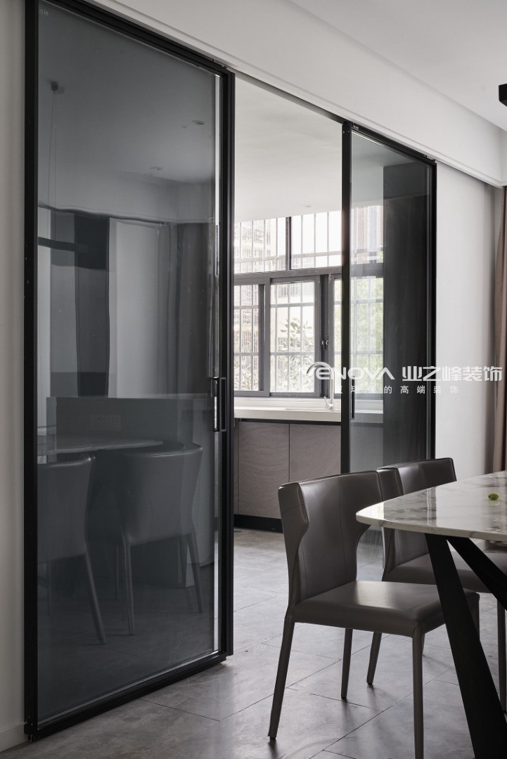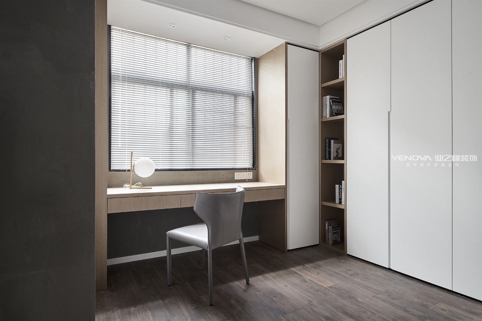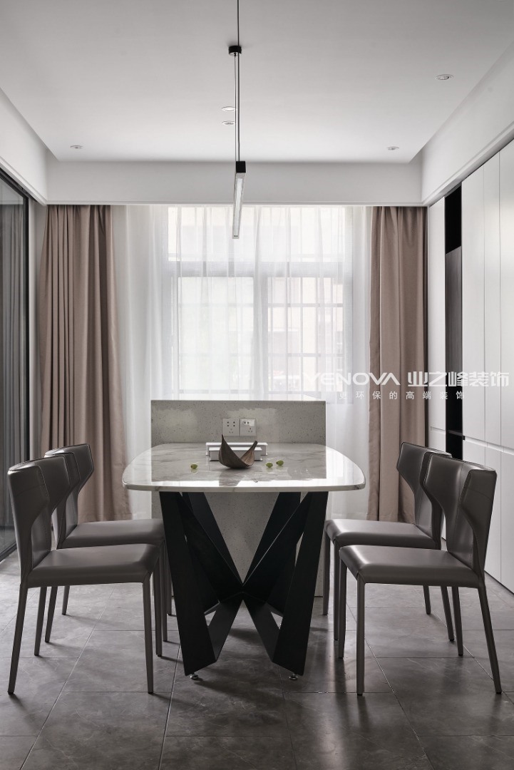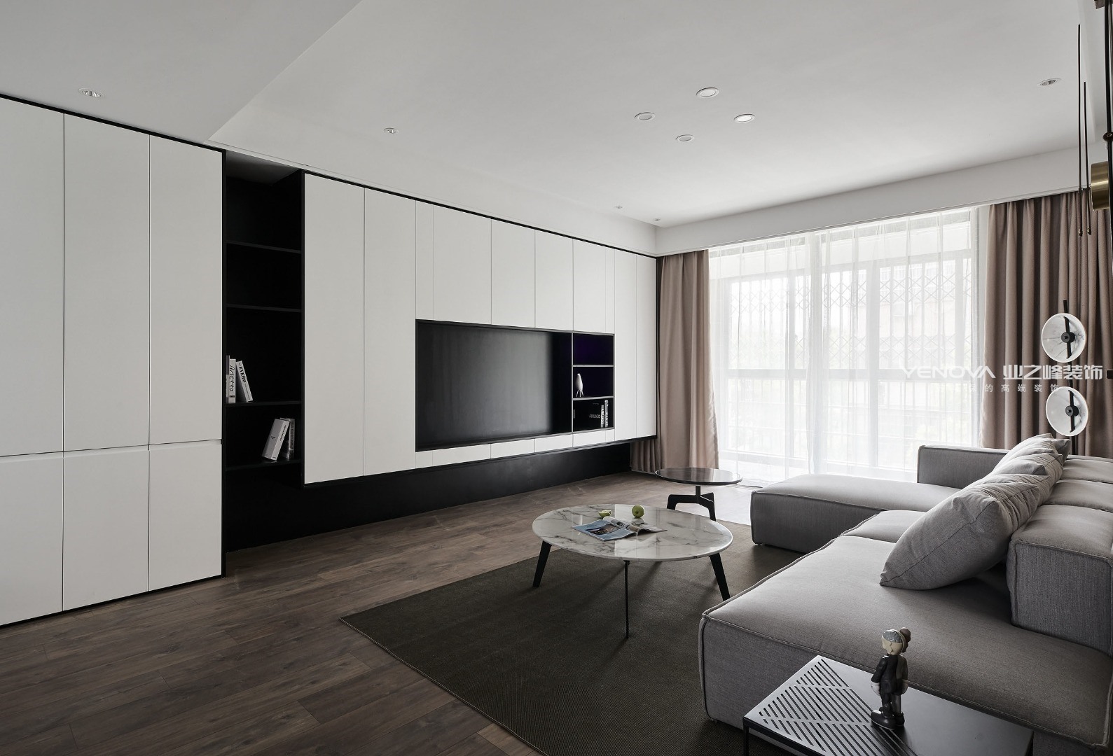 本案是150平的三室户型,现代简约风格,客餐厅同出一空间,整体选用黑白灰为主色调进行设计,沙发背景选用原木色系的木饰面弱化了黑白的生硬感,简单大气。餐厅延续客厅色调大部分主要以纯白为主,提亮用餐空间整体色调。主卧纯黑色床头造型,给人一种沉稳一下让人安静下来的感觉,营造舒适的休息空间。