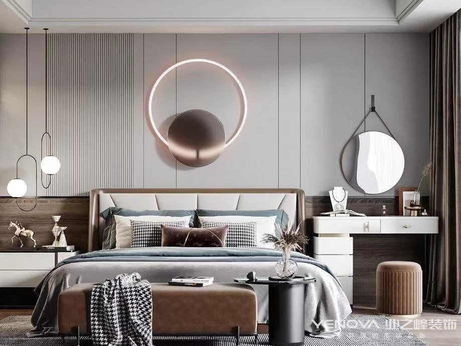 整个空间以杏色墙布为主,少量木色护墙板为辅,整体温馨不失时尚感,配合少量金属材质的灯饰提升
