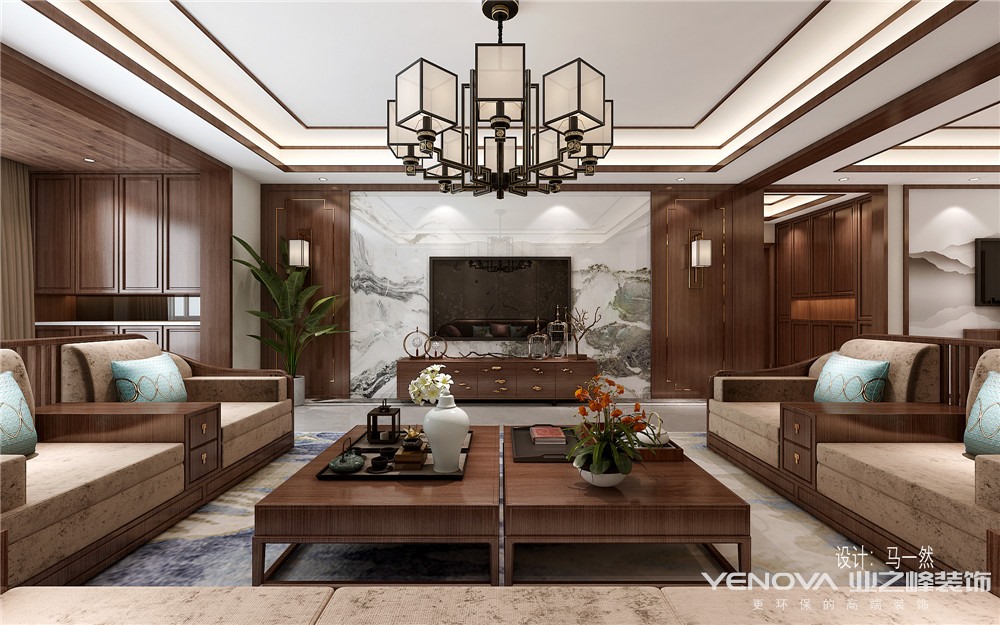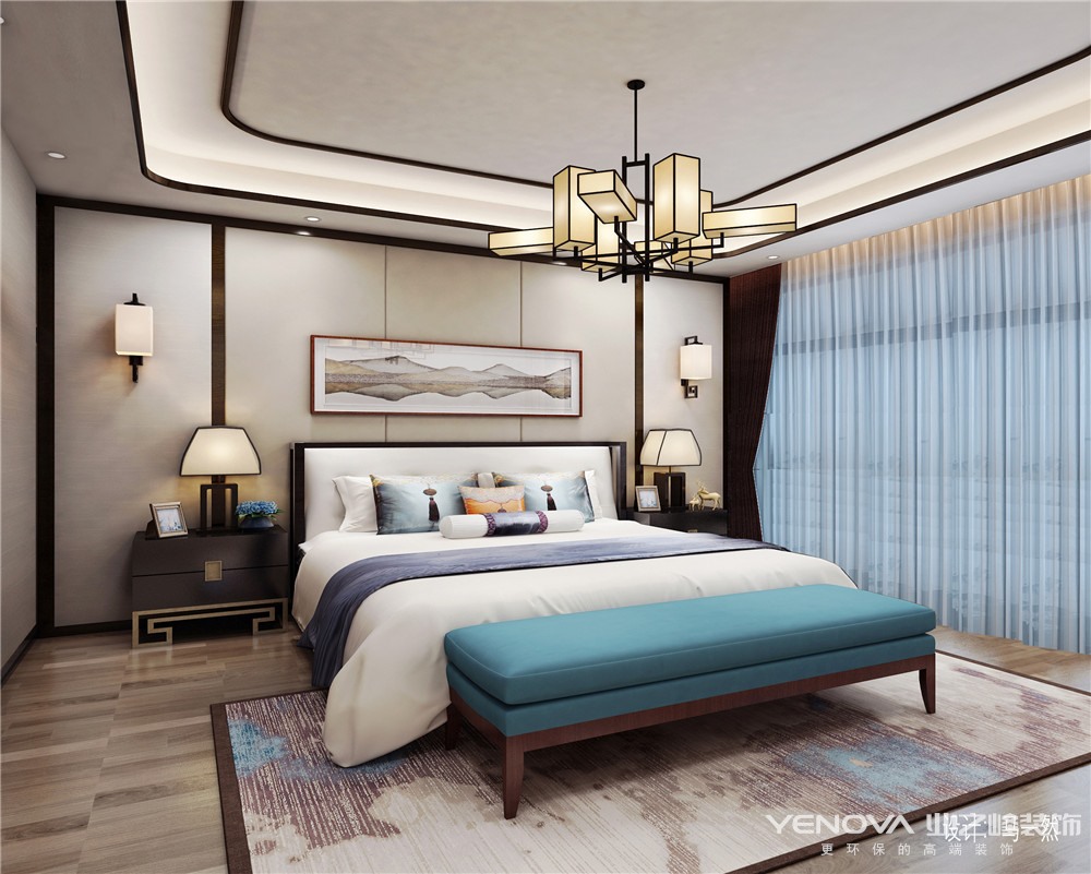 客厅。“相交对称”是本次设计的主题,以结构为主,对称为辅也是本次案例的设计精神。木质的电视柜同两边木质的沙发组交相辉映,走道区域运用中国传统文案配以简单的线条框,以暖色灯色为主调,为中式线条添了一些柔和,使空间不再生硬冷酷而富有了人情味。整个空间弥漫着奢华与浪漫的氛围,硬朗的材质,明快的色彩对比、柔美的家居、雅致的配饰,赋予了空间的素净,明亮的神采。墙面上运用山水风景为整体结构添加了源远流长的韵味。卧室空间卧室设计元素简练、抽象,墙面装饰的材质特殊性,彰显出时尚、高雅的生活品质。