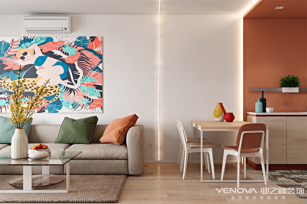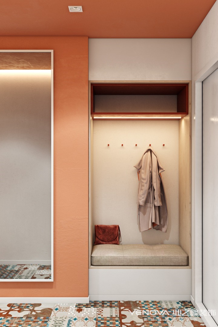 客户是单身女士,在忙碌工作的间隙希望有一个相对合理、舒适的属于自己的空间。对于原始户型无法放下入户鞋柜、厨卫相对的结构很不满意。在于客户协商后,舍弃独立餐厅区域,餐厨关系更紧密,整体风格简约时尚,没有太多的造型。白色、原木色、奶茶色为主色,配以橘色大面积提色,整个空间洋溢青春、洒脱。