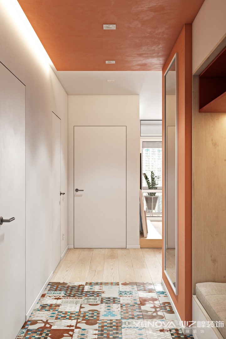 将厨房门调换方向后,整个门厅区域规整后,地面采用原木木地板与花砖结合,空间划分。