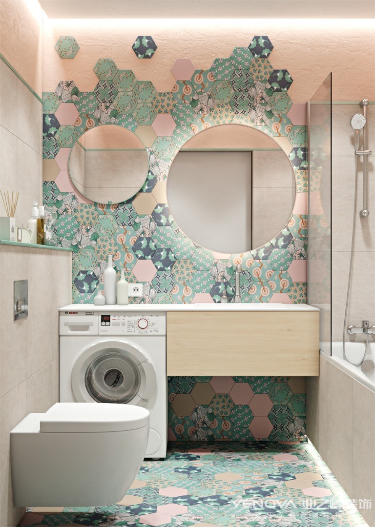 卫生间将原有门洞上移,做墙排马桶后,把空间合理利用,并藏下洗衣机。用六角花砖与艺术涂料配合,嵌入洗墙灯,高颜值的卫生间,泡澡也有美美的心情。