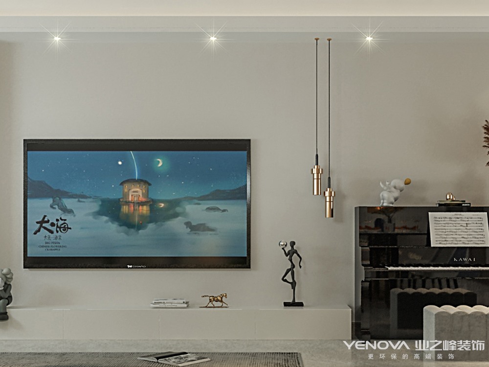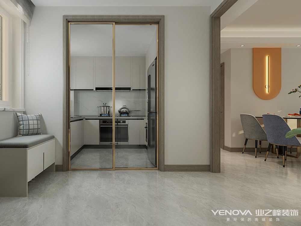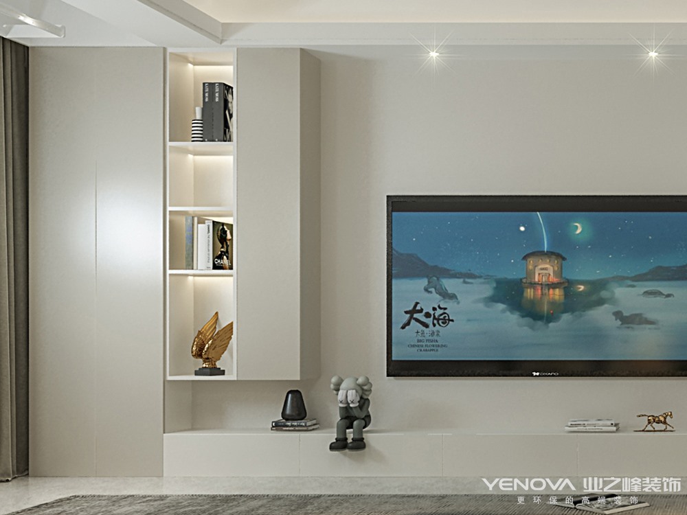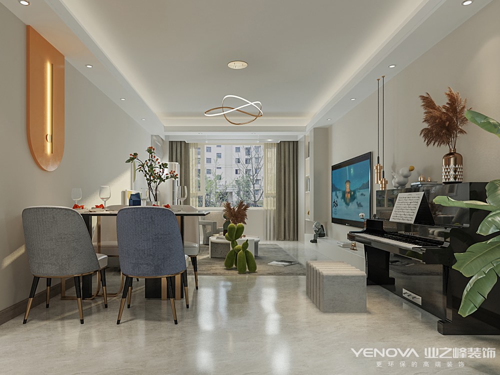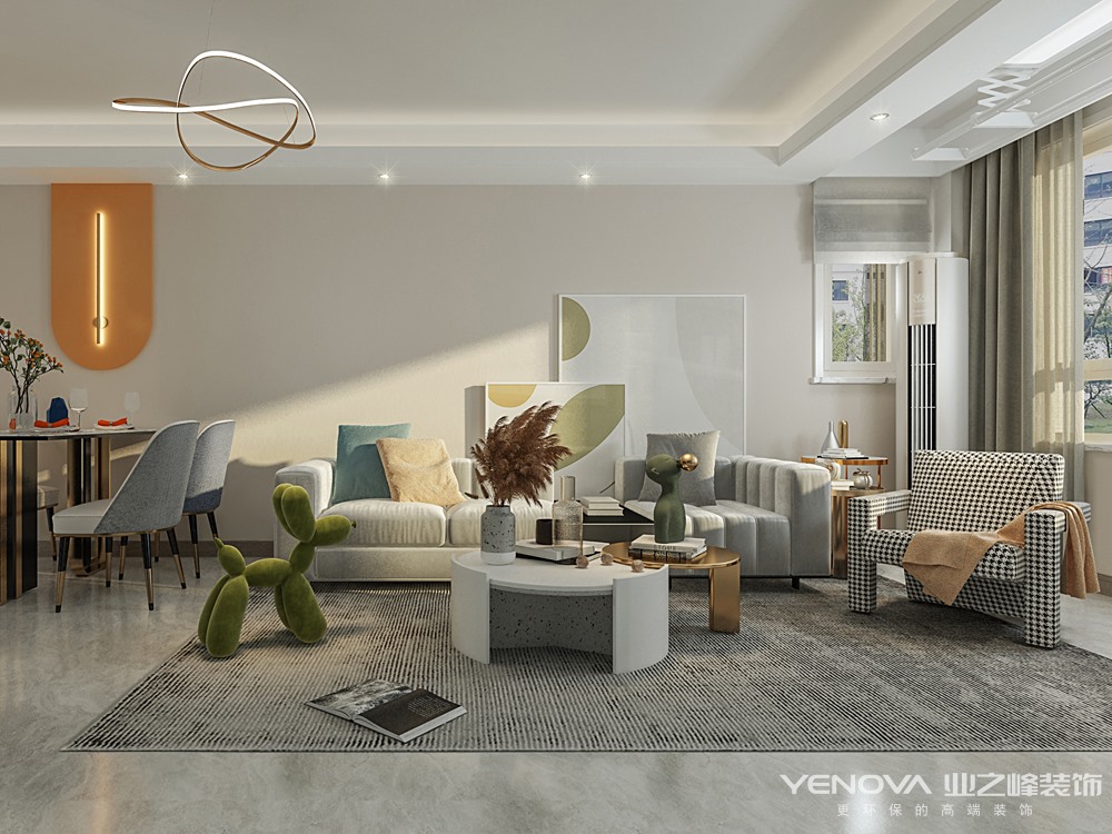 本案整个空间格调以温柔的浅色调为主,浅咖色与奶白色的电视柜为空间增添了整体性,同时增加了储物功能,圆润的弧形墙板搭配爱马仕橙成为就餐区的一大亮点,为吃饭这件事增添了乐趣。