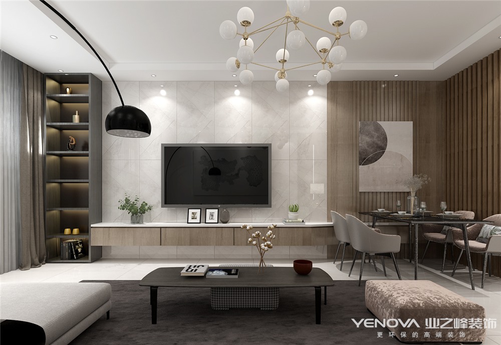 客厅空间采用深色书柜和木质结合,深浅搭配是空间达到平衡,不会看起来轻飘飘的感觉,中间质感大板瓷砖。软硬结合。整体家具全部采用简单舒适度高的,无过多装饰。