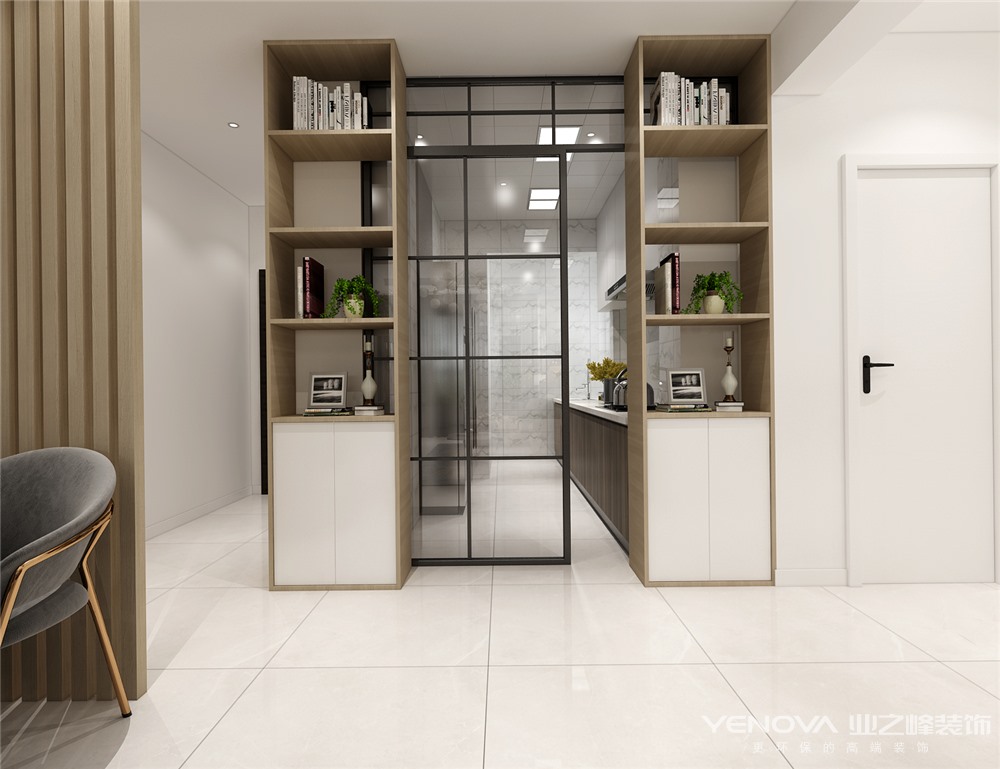 整体风格和搭配多以简洁明亮为主。入户左手边墙体改成Z字形,一边满足日常收纳,一边给到厨房使用。入户放置轻薄玄关进行遮挡就餐区域。