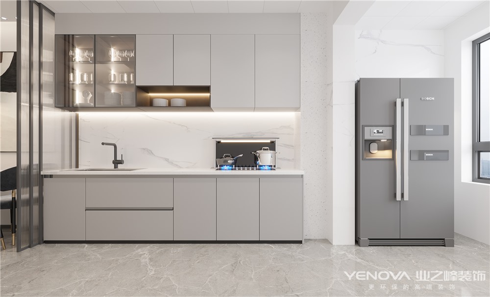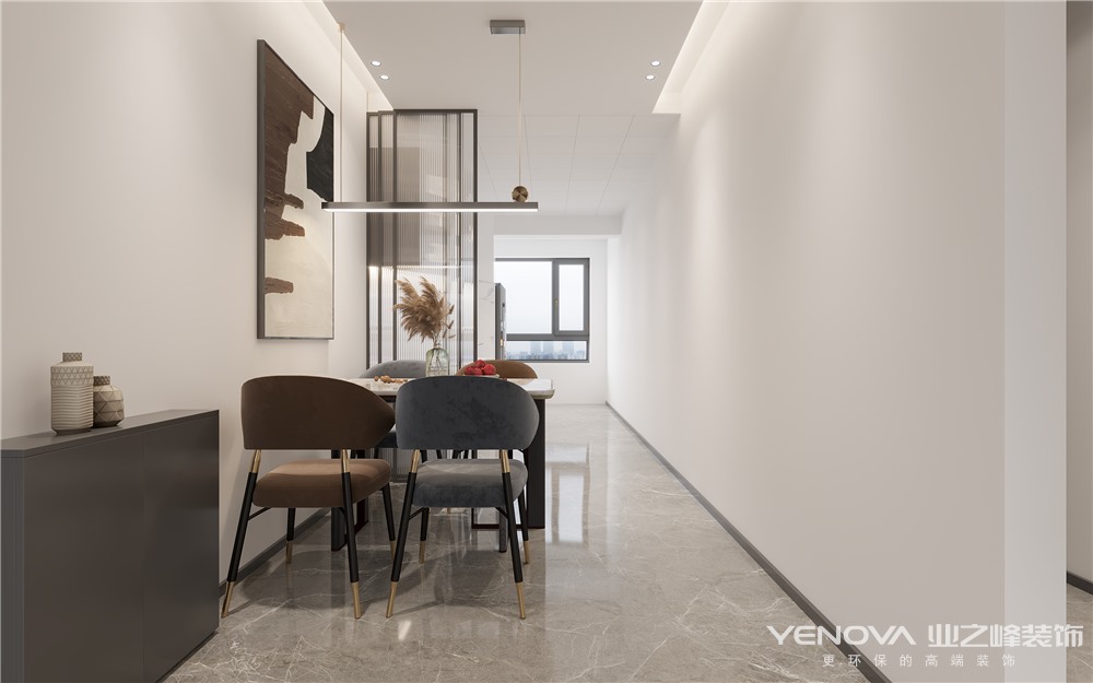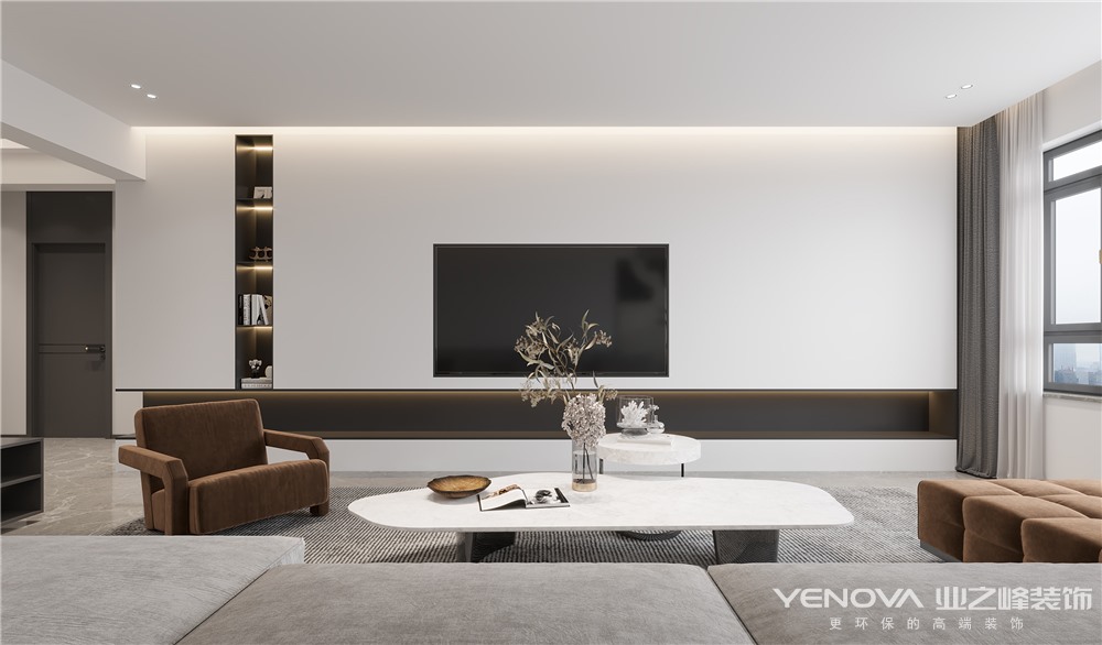 整体采用浅色系为主,地砖采用灰色亮面地砖,纹理清透。使空间看起来心旷神怡。为了满足日常入户收纳,进门选择矮柜体,不遮挡光线,客厅整体采用白色为主,白色简洁的背景墙加入黑色金属板点缀画龙点睛的作用,加上灯光营造整体温馨的氛围感。沙发背景墙和入户门转角处改成弧形墙体是空间看日来更家柔美,阳角可能给人很锐利不舒服的感觉。沙发背景墙采用最素净的灰色墙布。