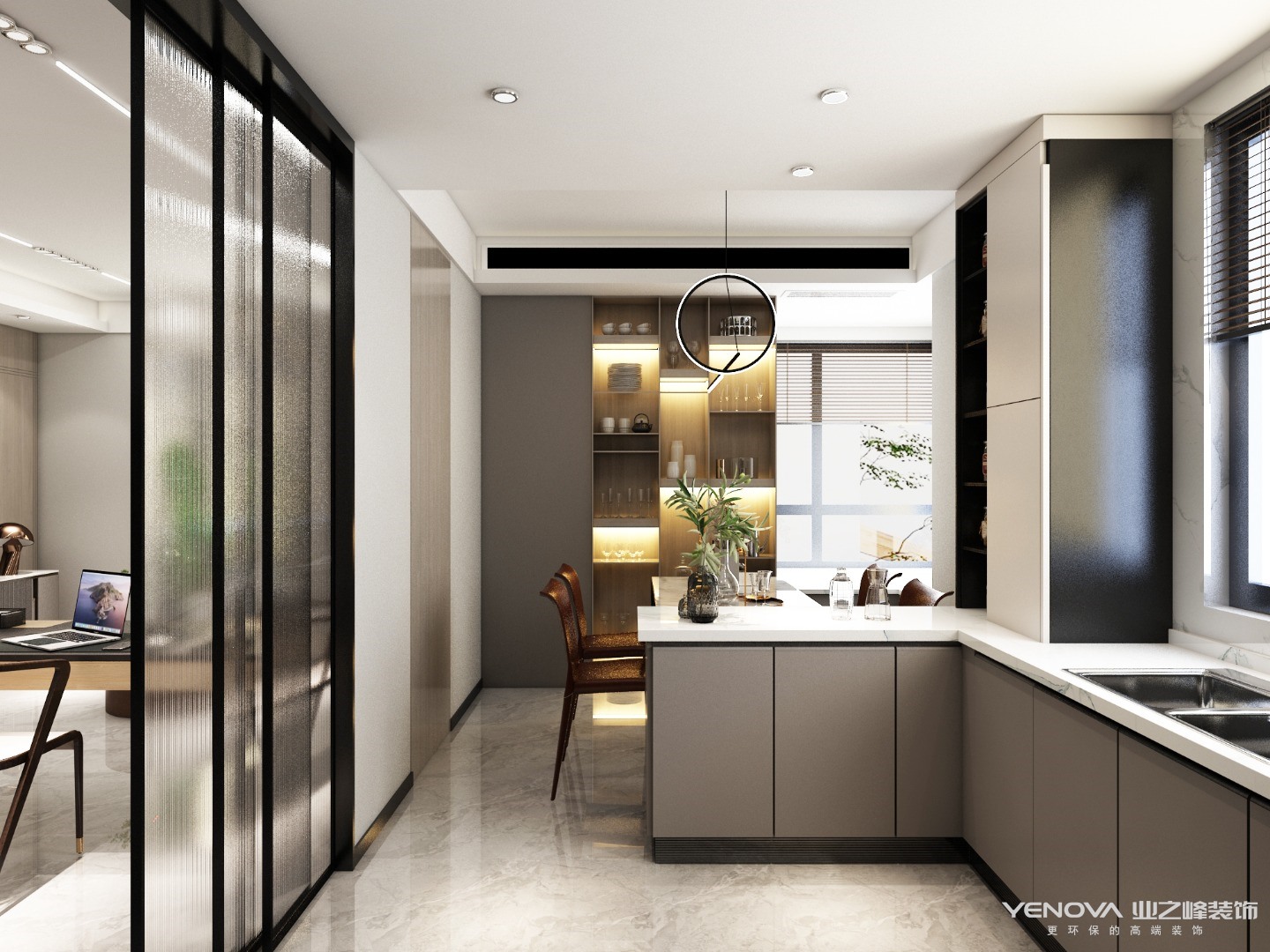 原始户型为三室两厅,两个卧室一个书房,在使用功能把原有书房和厨房的墙体打通,使厨房的面积增大把餐厅也融入其中,做到厨房餐厅一体。这样设计不但空出原有餐厅位置留给门厅使门厅变得宽敞,还使厨房面积扩大一倍。比原有小厨房无论从美观上还是从实用上都得到了很大的提升。