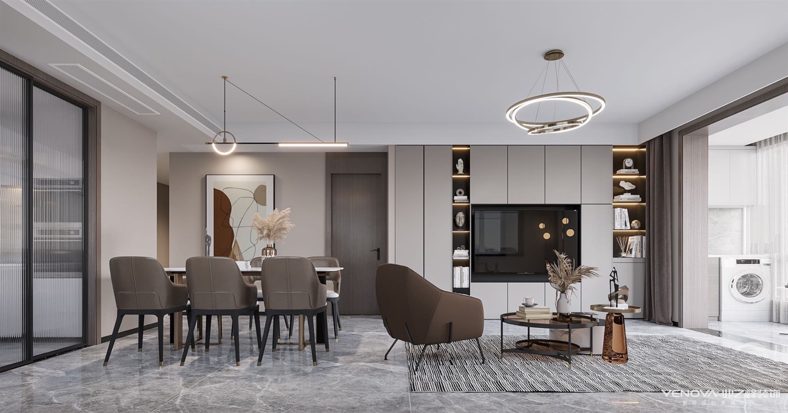 该居室是一家三口,父母偶尔来住,男主人和女主人想要更加舒适、温馨的环境,男主人在家办公的时间较多,想要办公区域大,在主卧区域增加书桌功能。整体都是以棕咖色调为主,给人更加舒适的环境。