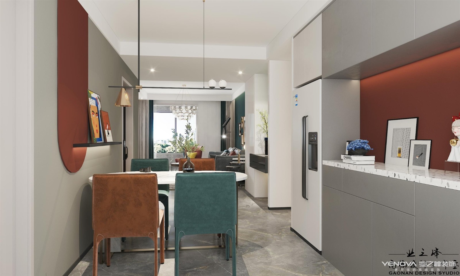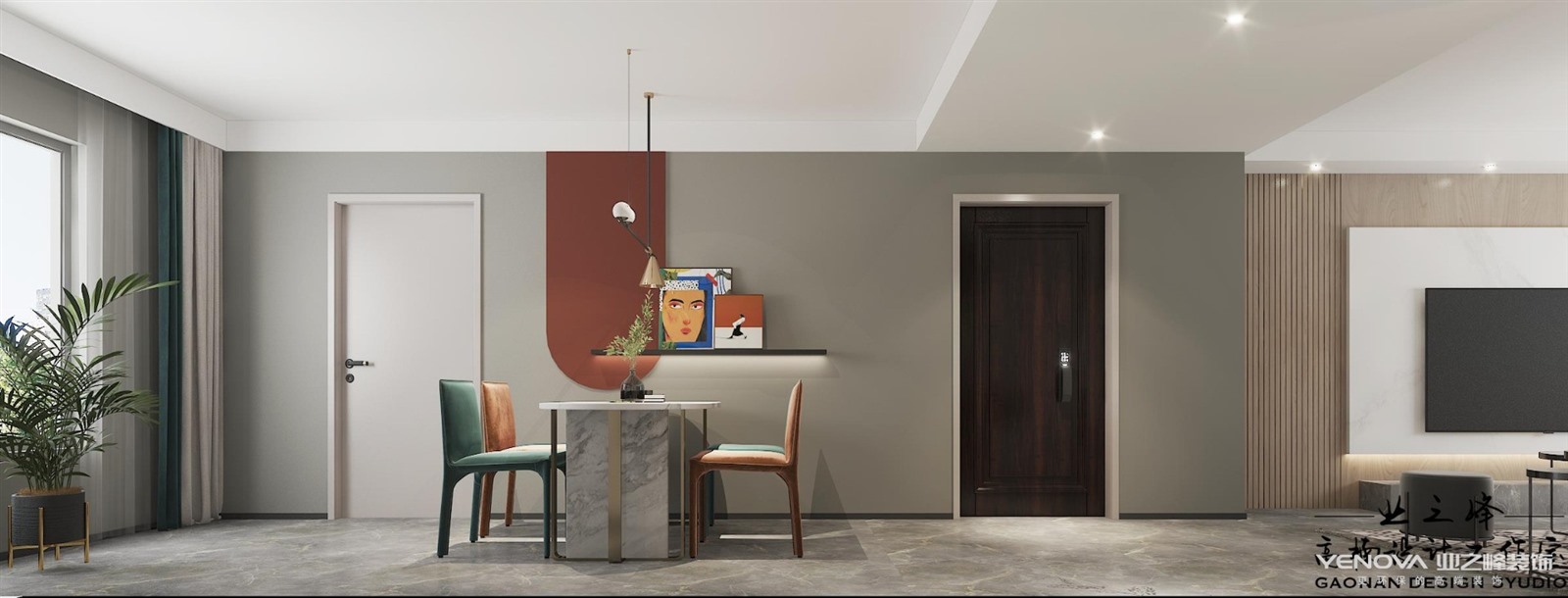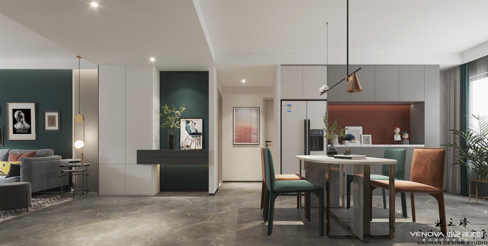 本案是杨柳春风123m²户型的案例,,北欧风格在选材,设计和工艺上都拥有纯正的北欧风格,在风格上沿袭北欧风格的一贯特点,精炼简洁,造型紧凑和线条明快。在家具选用上注重实用和自然,选用“万能色”白色为主色调和重要点缀色。墨绿色,红色等的搭配组合使用使的空间在时尚,优雅中不失温馨之感。布艺,木材,石材等多样材质的灵活运用也使得空间具有丰富层次感。