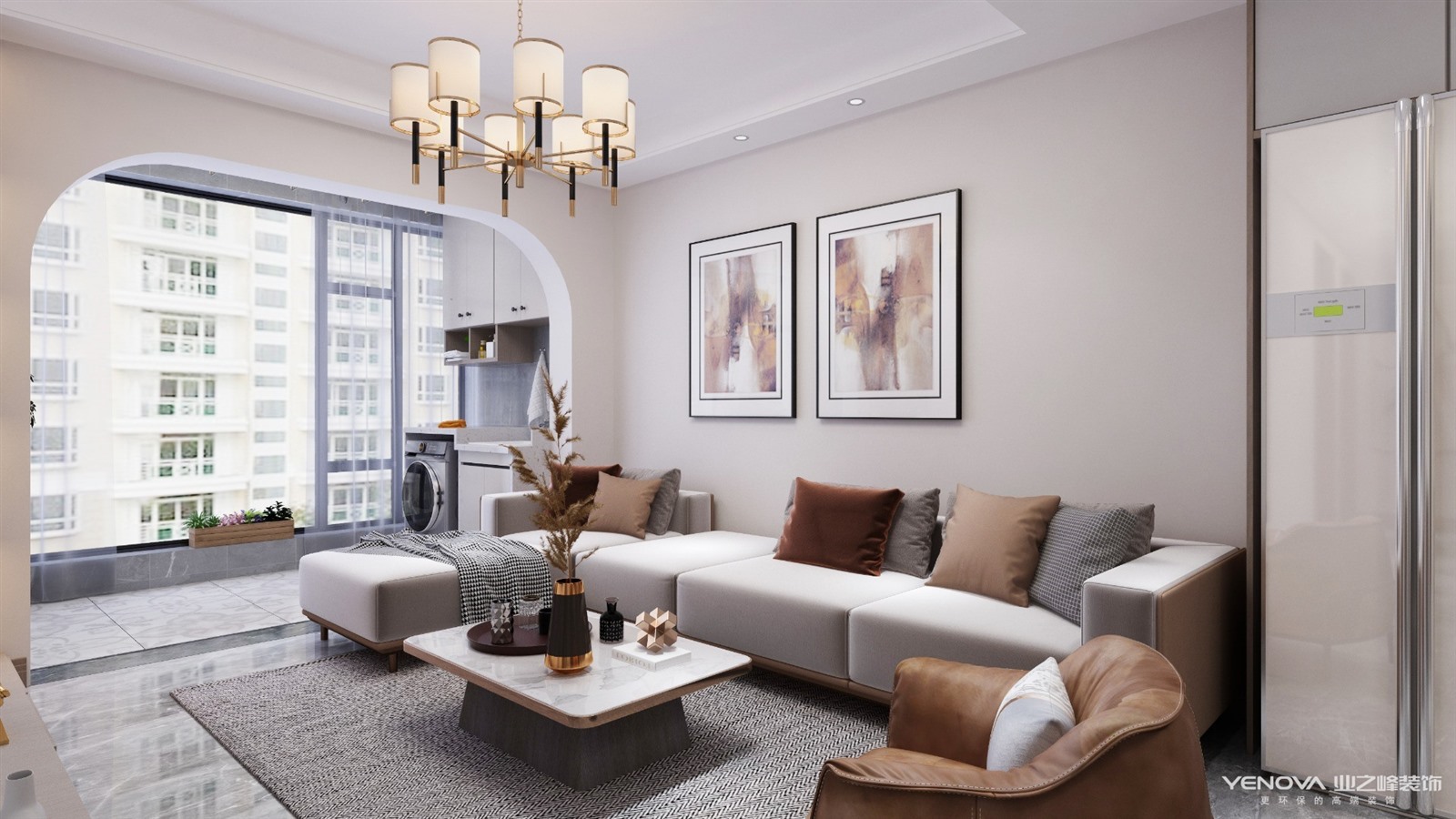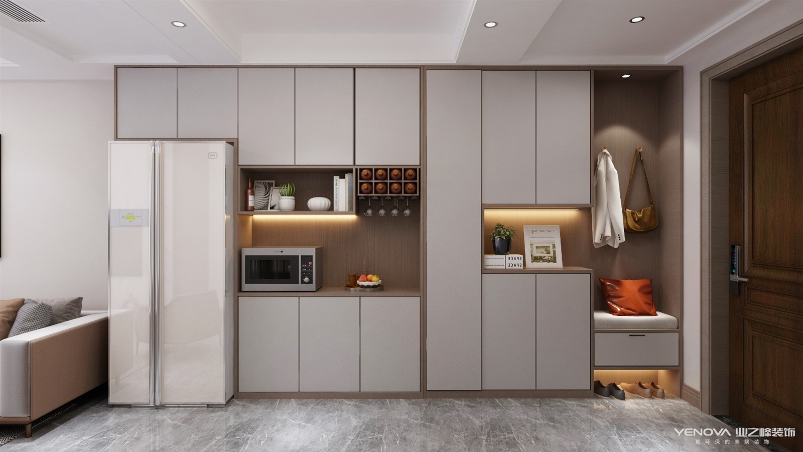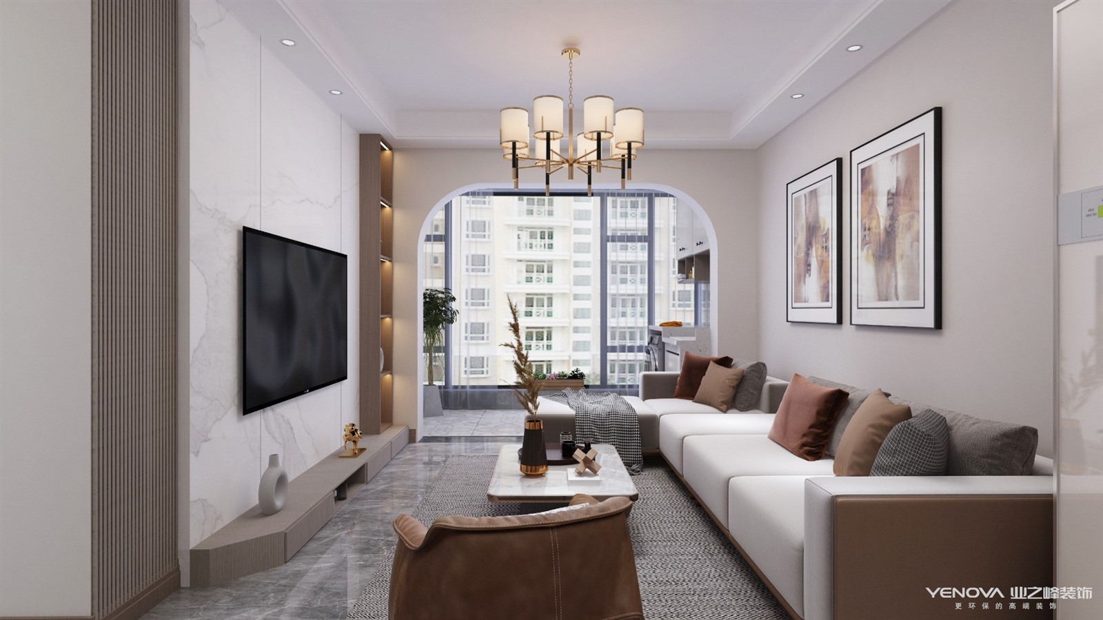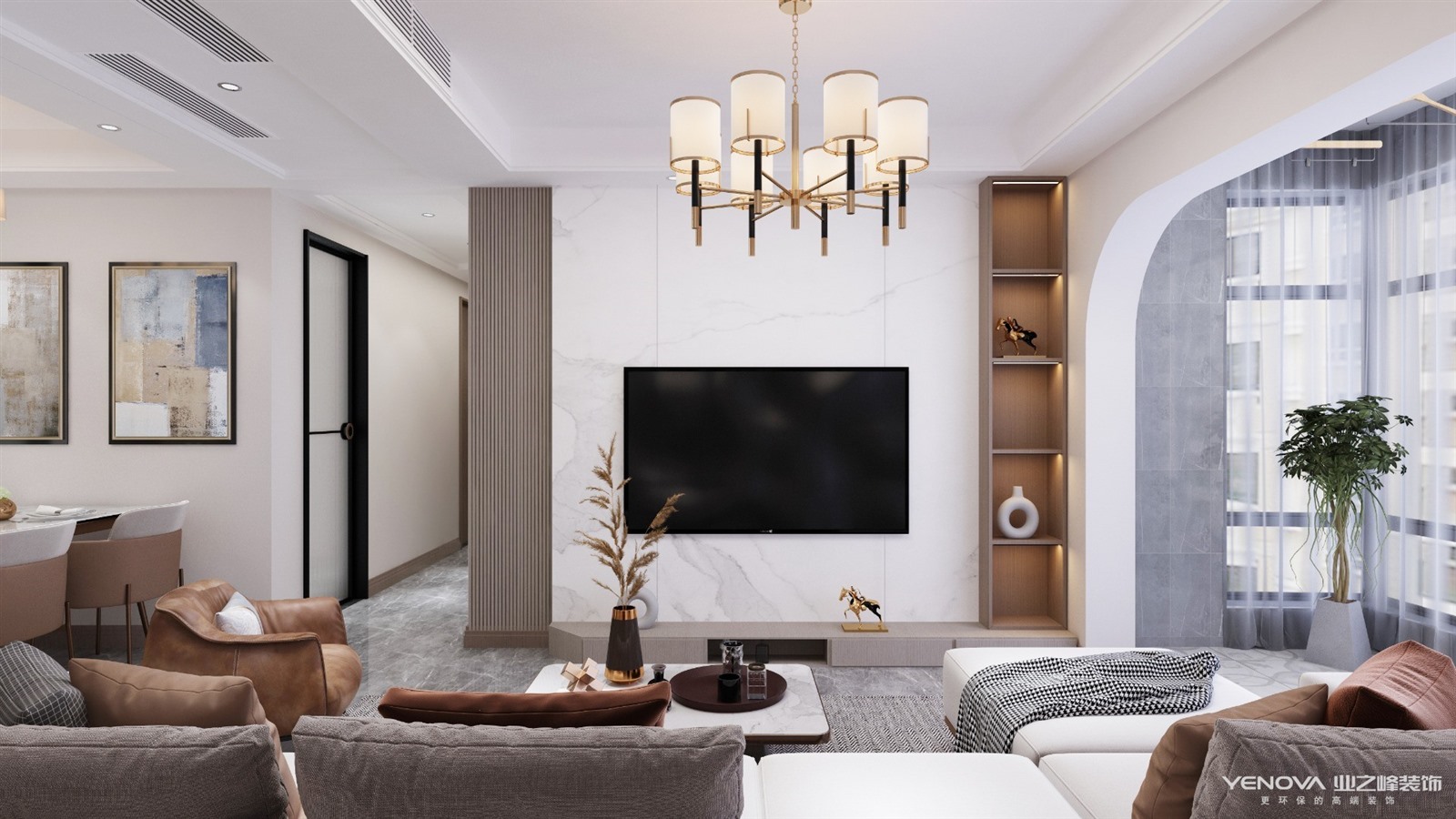 本套方案设计着重点是温馨,整体没有采用年轻人喜欢的黑白灰,淡淡的暖咖色很好的在冷色调与暖色调之间寻找到一种平衡,地面采用了冷灰色通铺瓷砖,避免了空间色调给人感觉头重脚轻,背景墙比较短,在左侧加了一个木隔断做视觉延长,右侧做了一个小的陈列柜,方便摆放东西,电视柜用的定制柜,不再有卫生死角。整体空间使用率非常高,没有卫生死角。业之峰装饰环保工艺,24年历史。