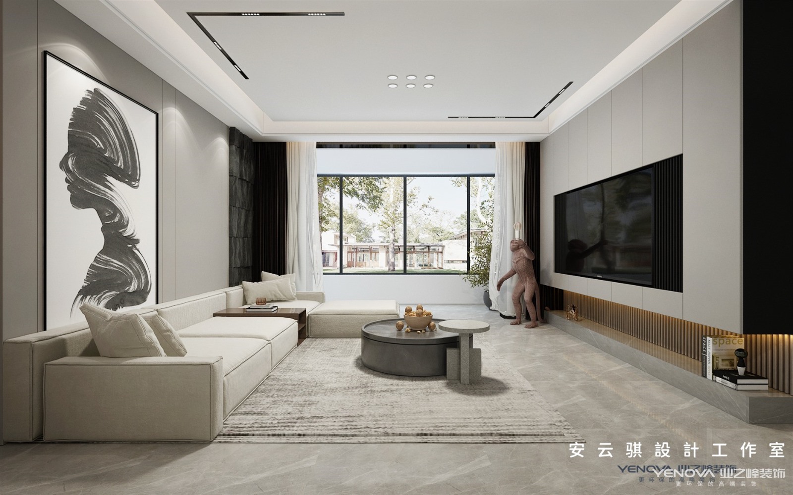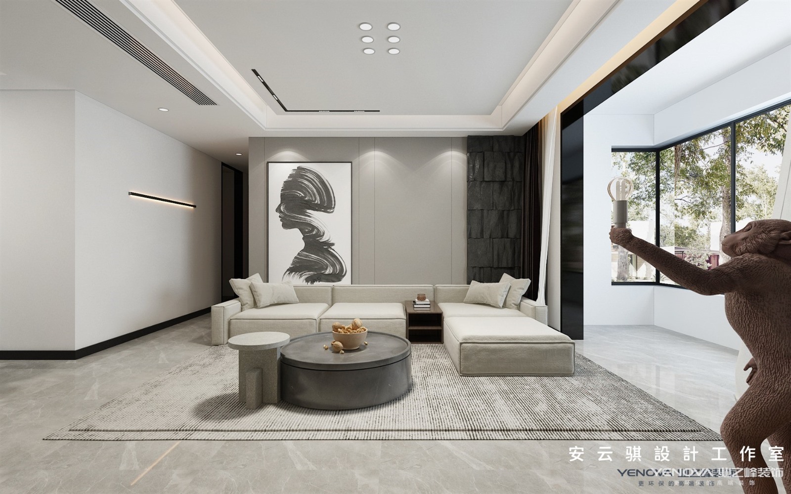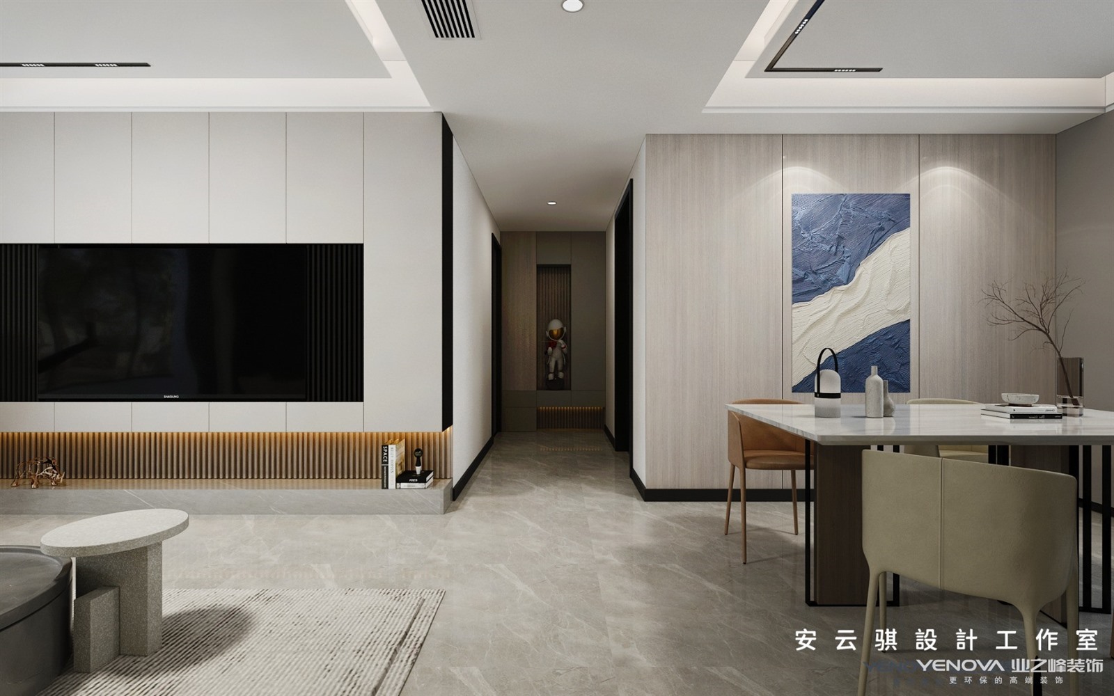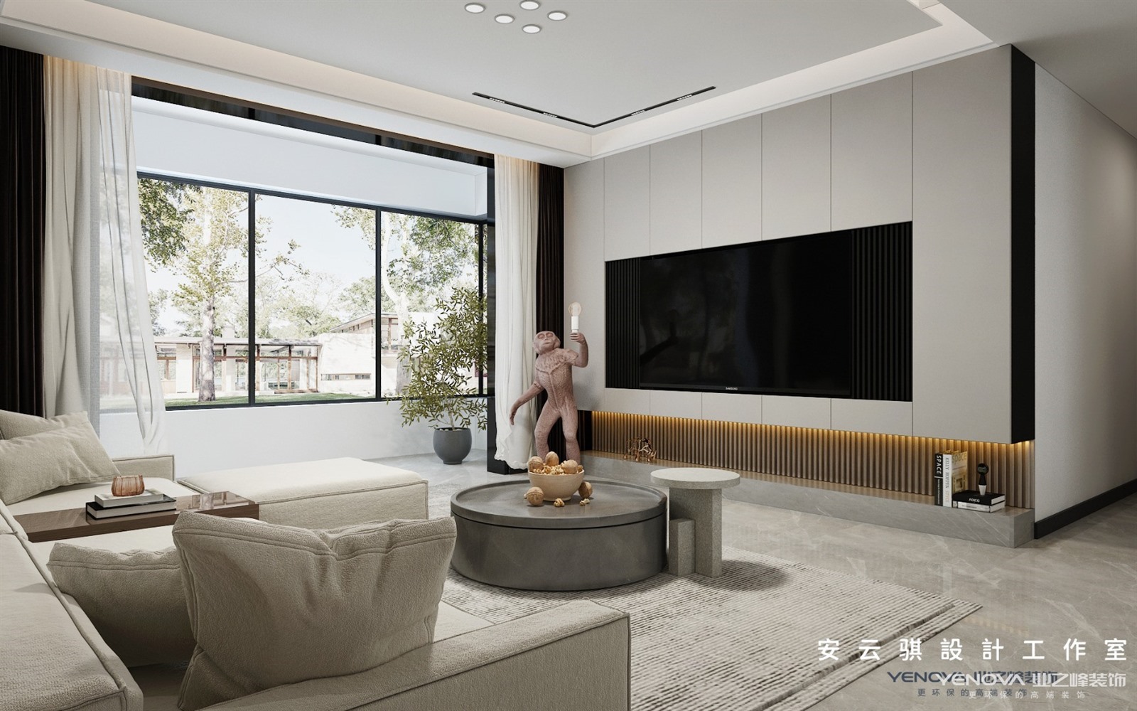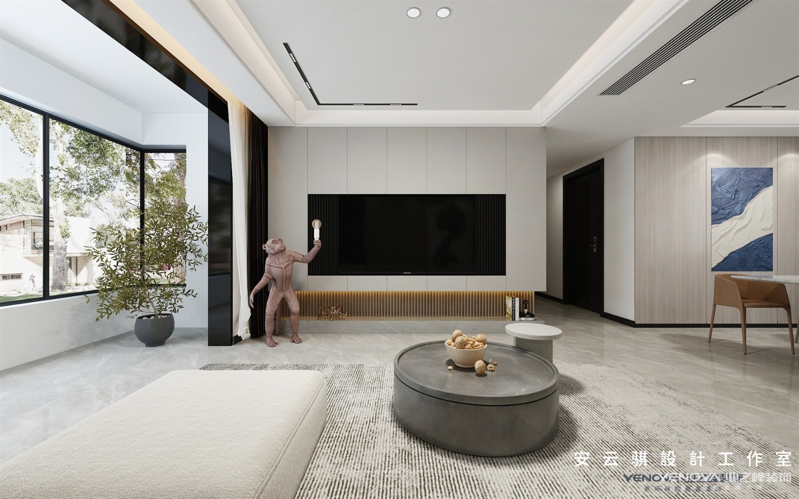 本案的设计为现代风格,电视背景墙采用柜子嵌入电视的做法,沙发背景墙采用大部分米色硬包,一部分用了岩石做点缀,和业主最终确定了最终设计方案