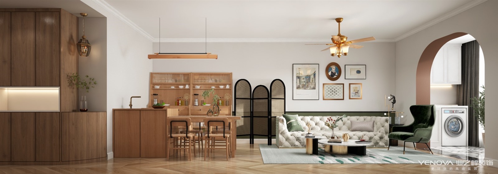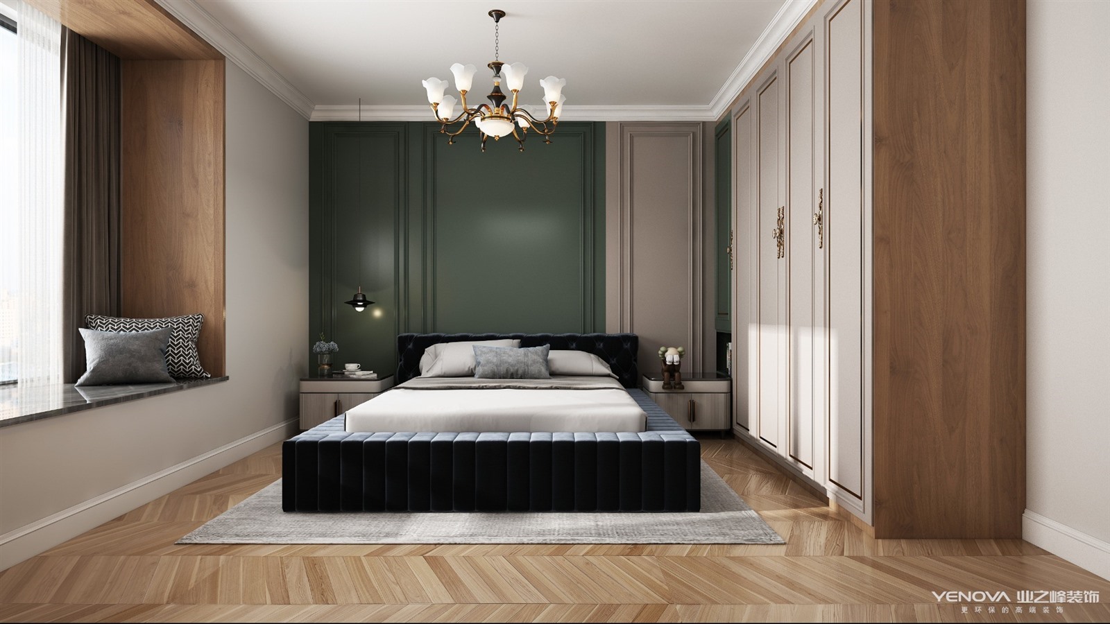 本案同样是一对海归小情侣,作为婚房既想温馨又想有品位,所以复古轻奢是海归派的最佳选择。复古的家具往往有着简约的线条,注重使用有质感的材料,搭配有花纹的抱枕、摆件等,这样整个画面层次感十足,避免了用力过猛的感觉。绿色、棕色、蓝色是常常会用到的颜色,碰撞起来和谐沉稳。