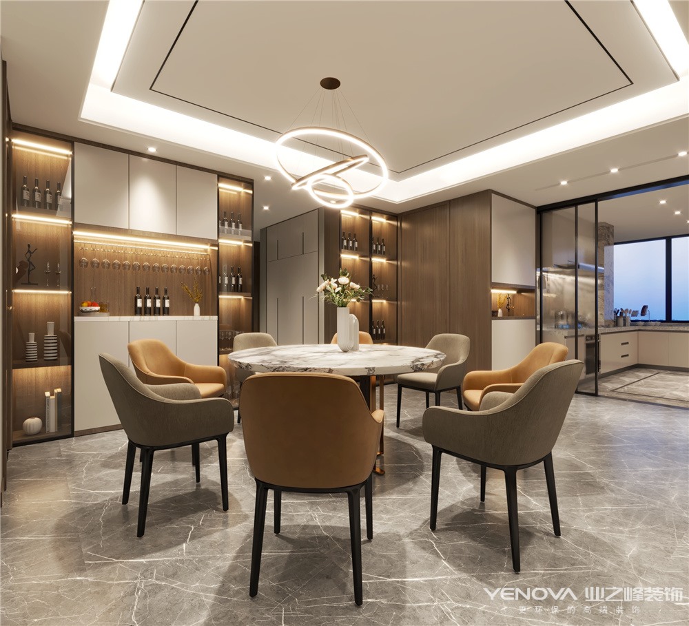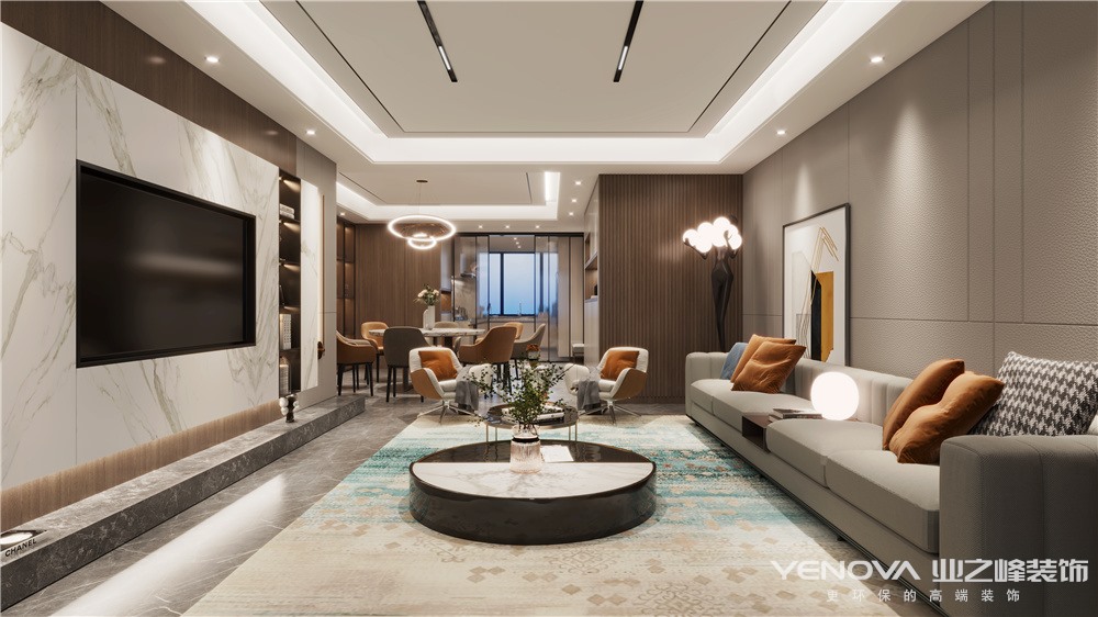整体色调温暖明亮,温馨而又舒适。过道两旁,左边为客餐厅区域,右边为厨房区域,进门左手边定制整排的柜子,满足入户鞋柜的功能和餐边柜功能,餐厅放大的圆形餐桌,满足业主一大家子人口的用餐,电视墙定制柜子,做石材造型,内藏灯带,顶面做悬浮吊顶,做无主灯设计搭配金属线条,再搭配简洁的灯饰,大气美观,沙发背景墙用护墙板做造型,和电视背景墙呼应起来,卧室都定制通顶的衣柜,搭配玻璃柜门,简约美观,原有次卫纳入主卧作为衣帽间,主卫生间定制钻石型淋浴隔断,和浴室柜相连,更大程度的利用空间;次卫生间留淋浴区和马桶区,台盆外移,定制双台盆,方便一家人的使用。西北角的房间作为洗衣房,满足洗衣晾晒及储物功能,且空间充足。
