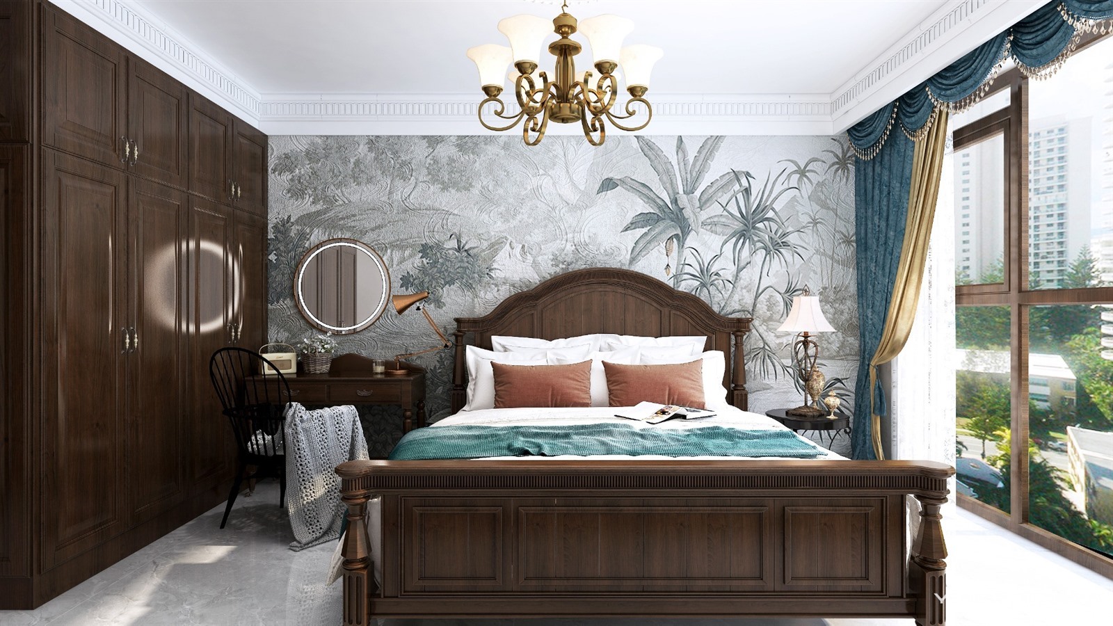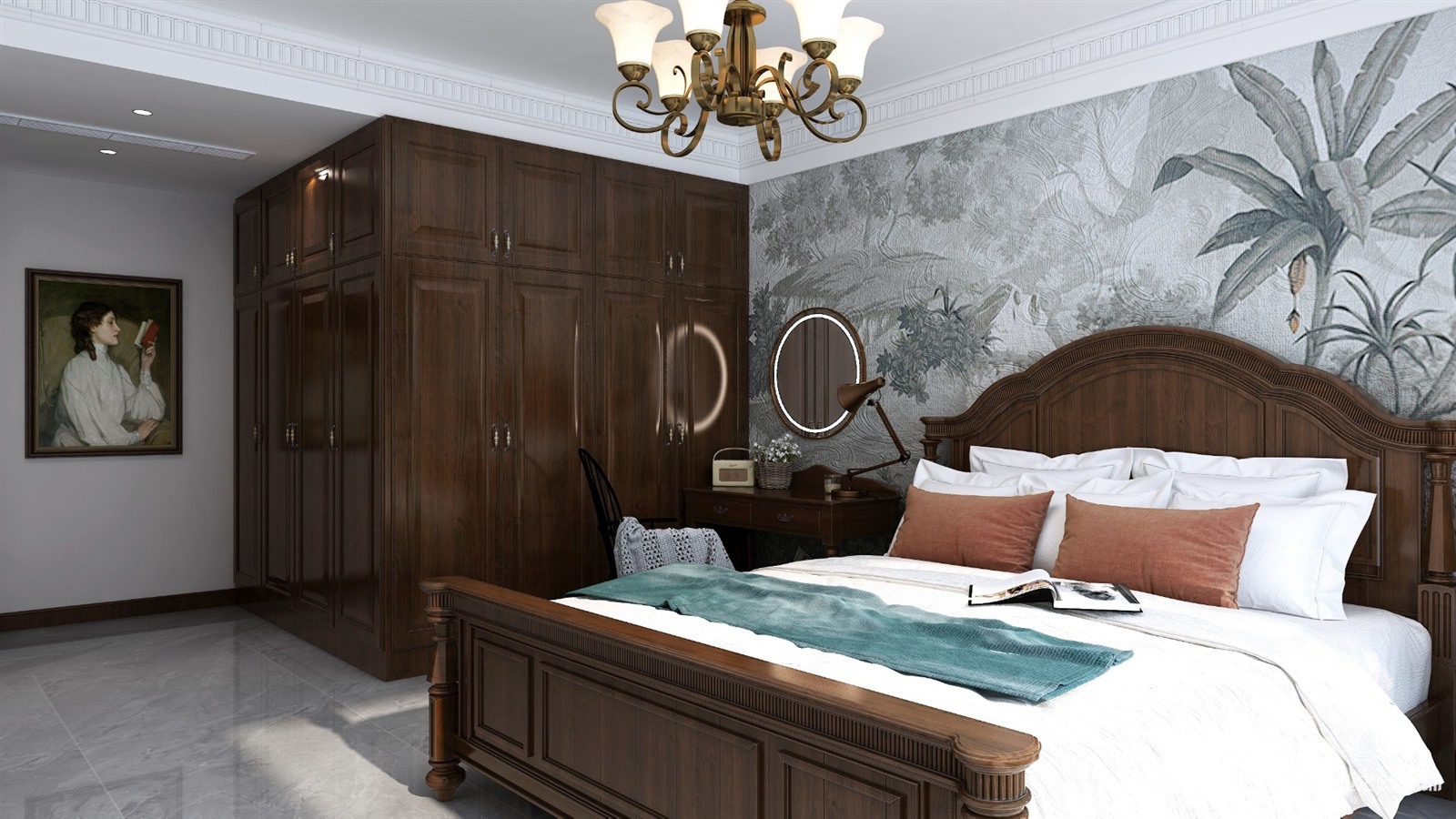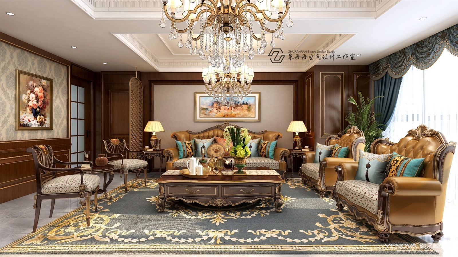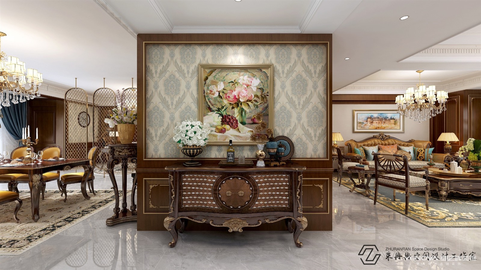 整个空间以美式的部分元素体现,属于自然风格的一支,倡导"回归自然",在室内环境中力求表现悠闲、舒畅、自然的生活情趣。本案运用了一些做旧的材质,如樱桃木饰面、仿古面的石材以及家具上的一些做旧的工艺等、让整个设计给人的感觉是沉稳的、有内涵的、低调不失高贵,也在相当程度上表现出其居住者的品位、喜好。家具搭配上选用造型典雅华丽又富有细节的新古典家具,华丽高雅中透露着精致的生活品质,高贵不失典雅的同时,也适合现代生活需求。布艺则以棉、麻等天然材质为主,都选用丰富的印花图案布料调节空间氛围。饰品、绘画、布艺的搭配在各自空间中强化着意韵气质的表达。