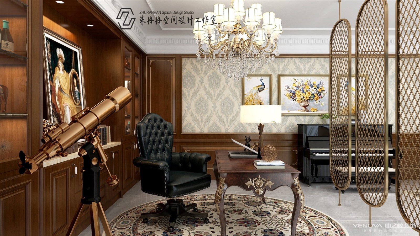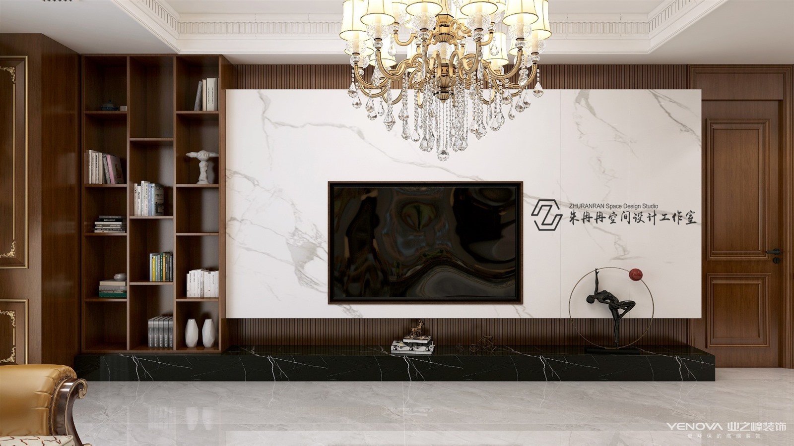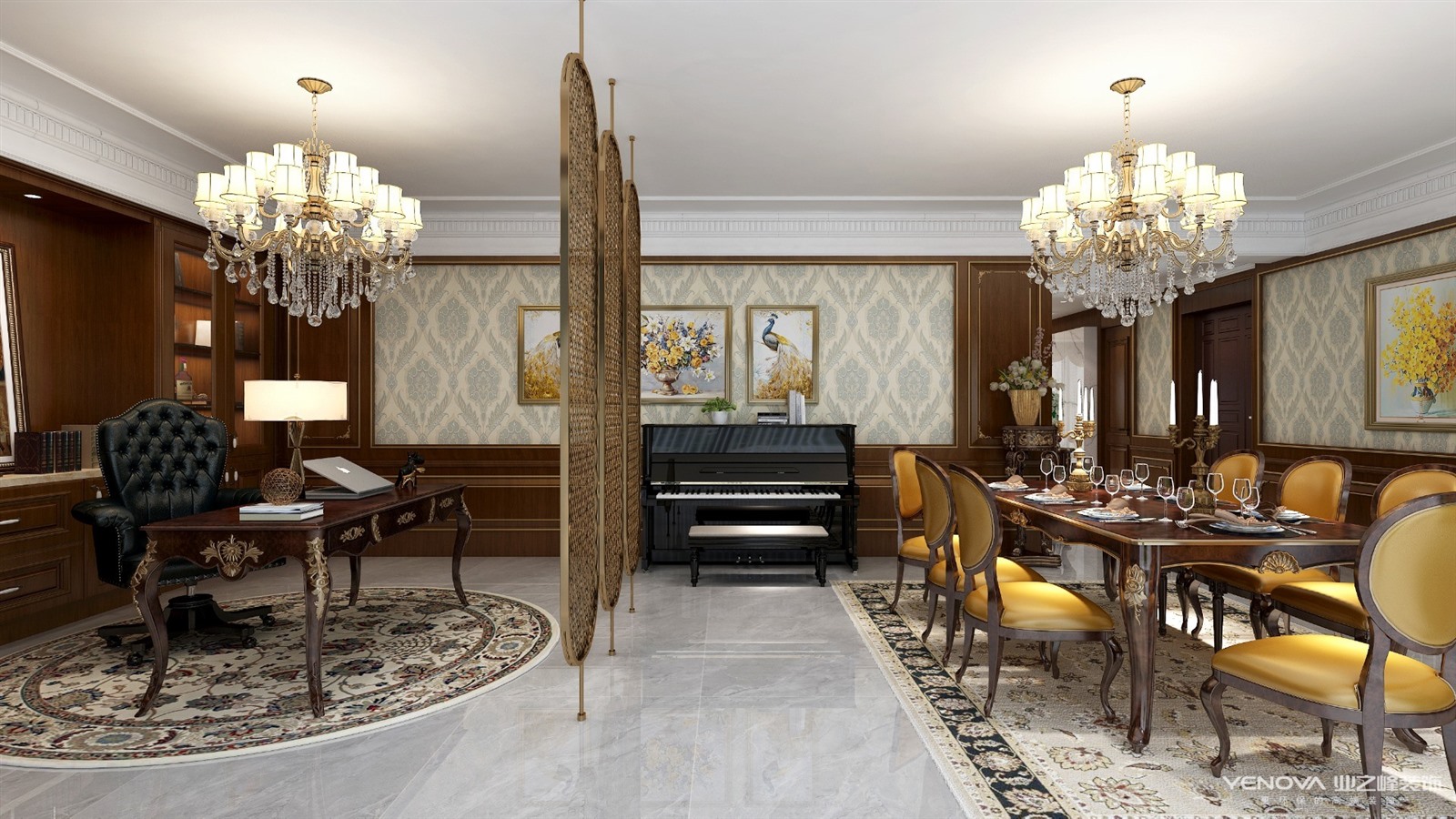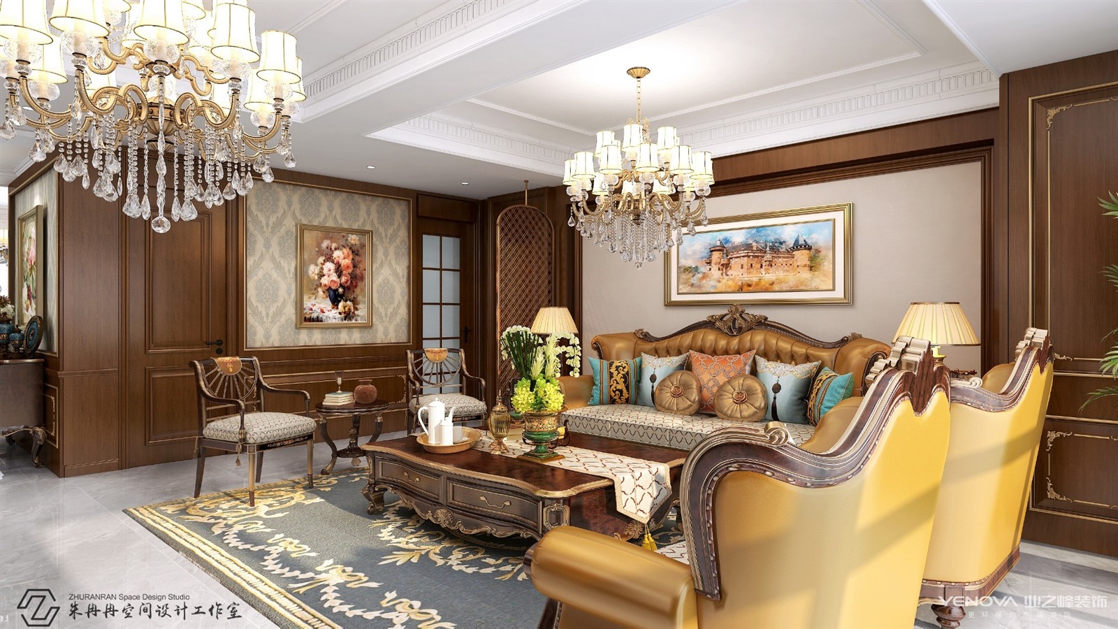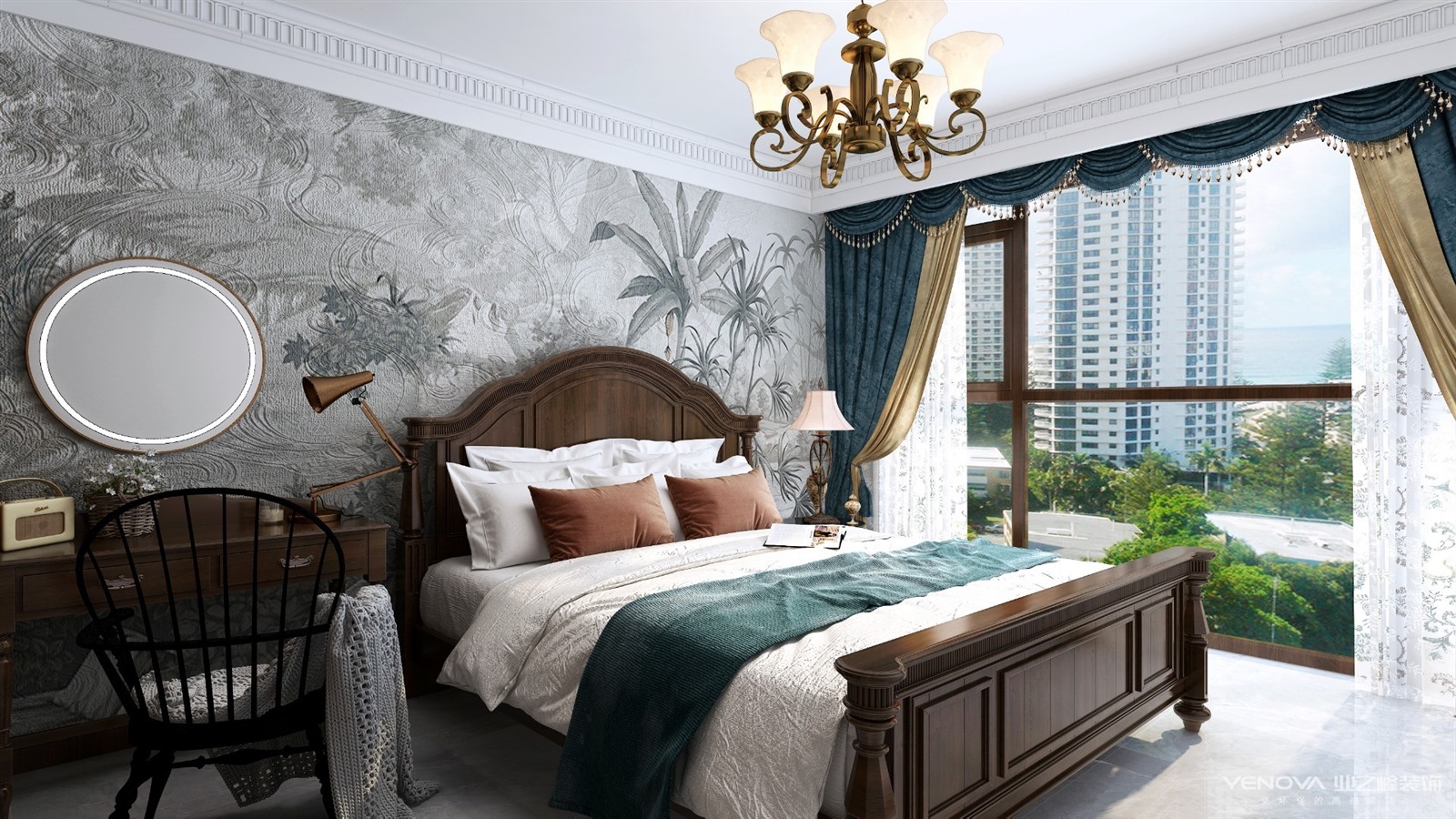 整个空间以美式的部分元素体现,属于自然风格的一支,倡导"回归自然",在室内环境中力求表现悠闲、舒畅、自然的生活情趣。本案运用了一些做旧的材质,如樱桃木饰面、仿古面的石材以及家具上的一些做旧的工艺等、让整个设计给人的感觉是沉稳的、有内涵的、低调不失高贵,也在相当程度上表现出其居住者的品位、喜好。家具搭配上选用造型典雅华丽又富有细节的新古典家具,华丽高雅中透露着精致的生活品质,高贵不失典雅的同时,也适合现代生活需求。布艺则以棉、麻等天然材质为主,都选用丰富的印花图案布料调节空间氛围。饰品、绘画、布艺的搭配在各自空间中强化着意韵气质的表达。