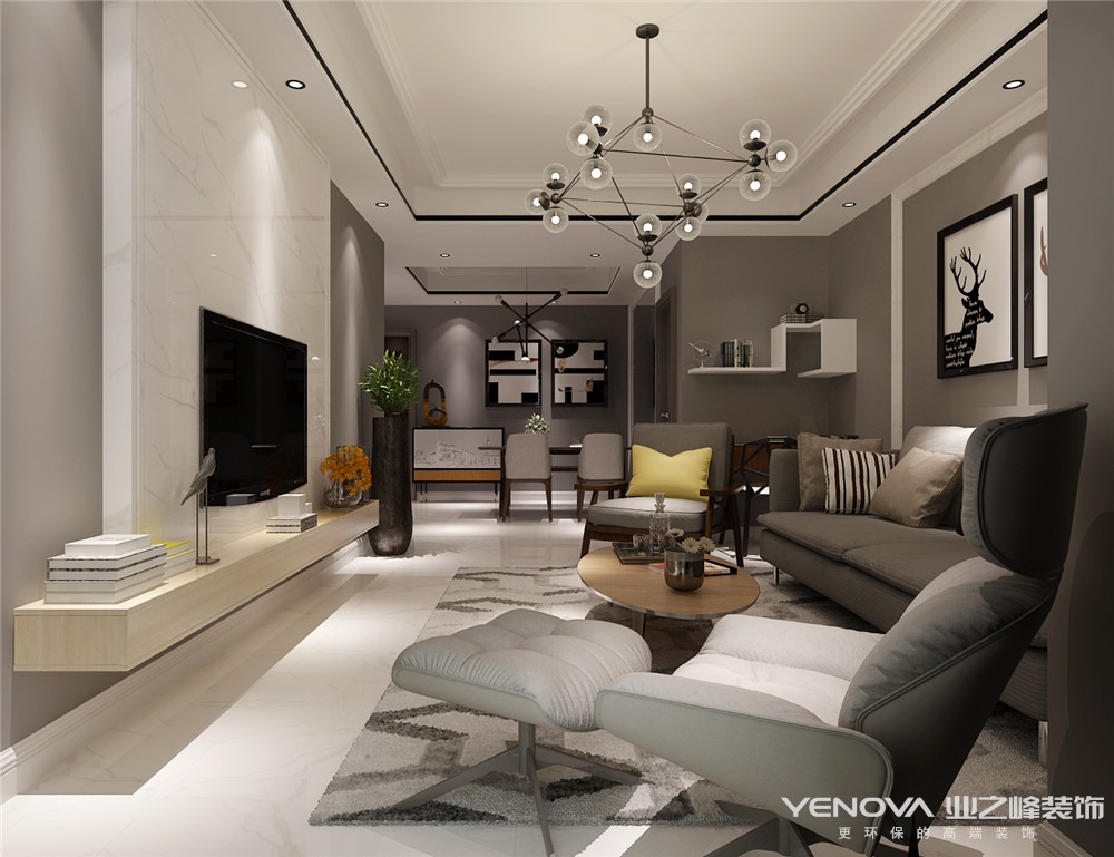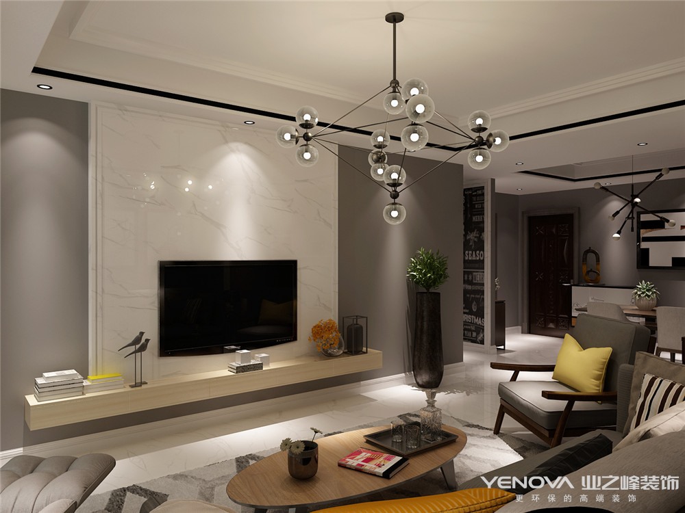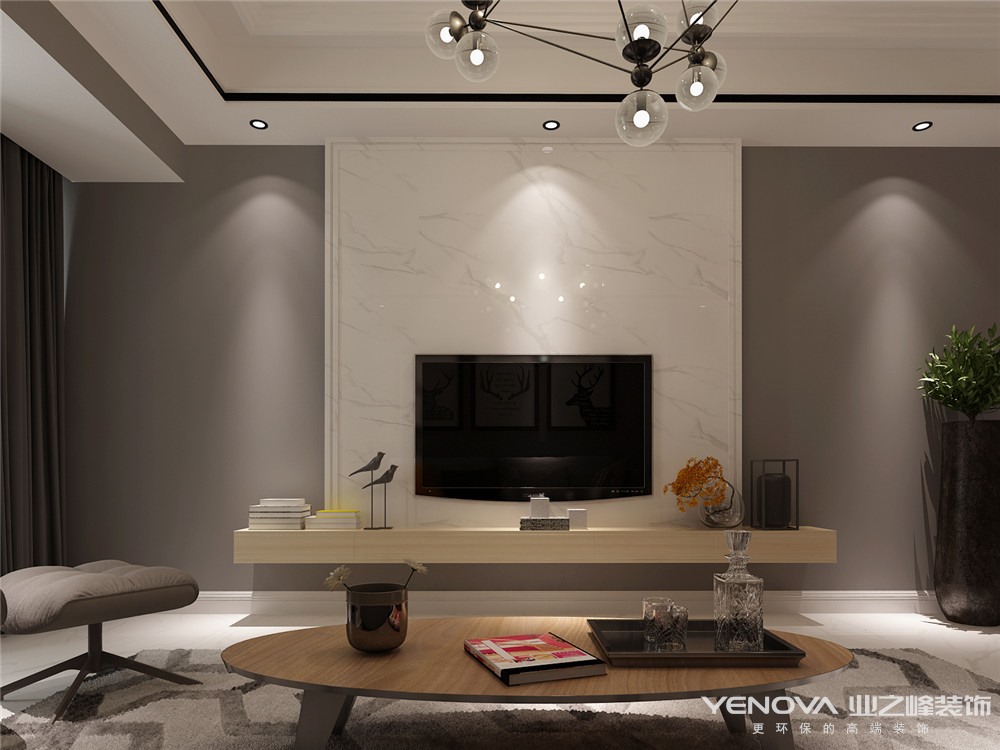 2. 现代的风格简洁,大方,电视背景墙采用石材,暗藏灯槽,做出悬浮感,吊顶的金属扣条造型爽朗.