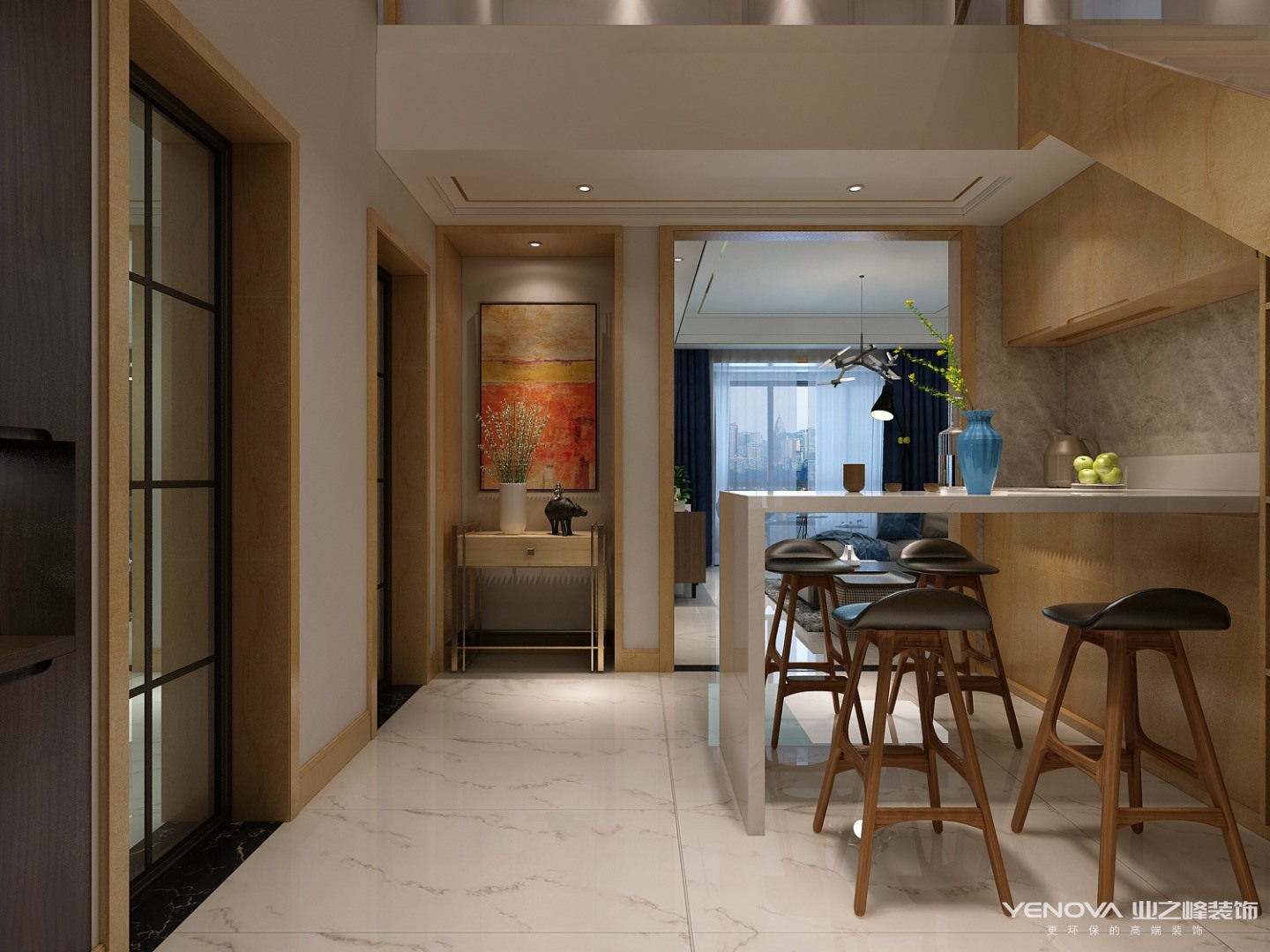 1. 为增加入户的仪式感,将一进门的楼梯间下方设计水吧台,增加休闲,学习空间,楼梯下方的空间可以做鞋柜,与储物空间.楼梯的玻璃扶手增减视线的通透感,木制台阶与储藏柜统一,又美观.