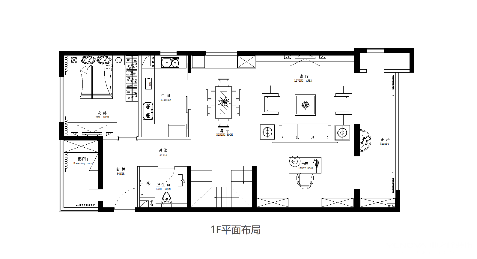本案是传统的复式空间格局,客餐厅是少见的横厅布局,其他空间只要保留三房格局,便可以满足业主一家三口人长居需求。作为新中式风格来说,我们更多的会考虑到传统思维方面,比方说细节风水布局。